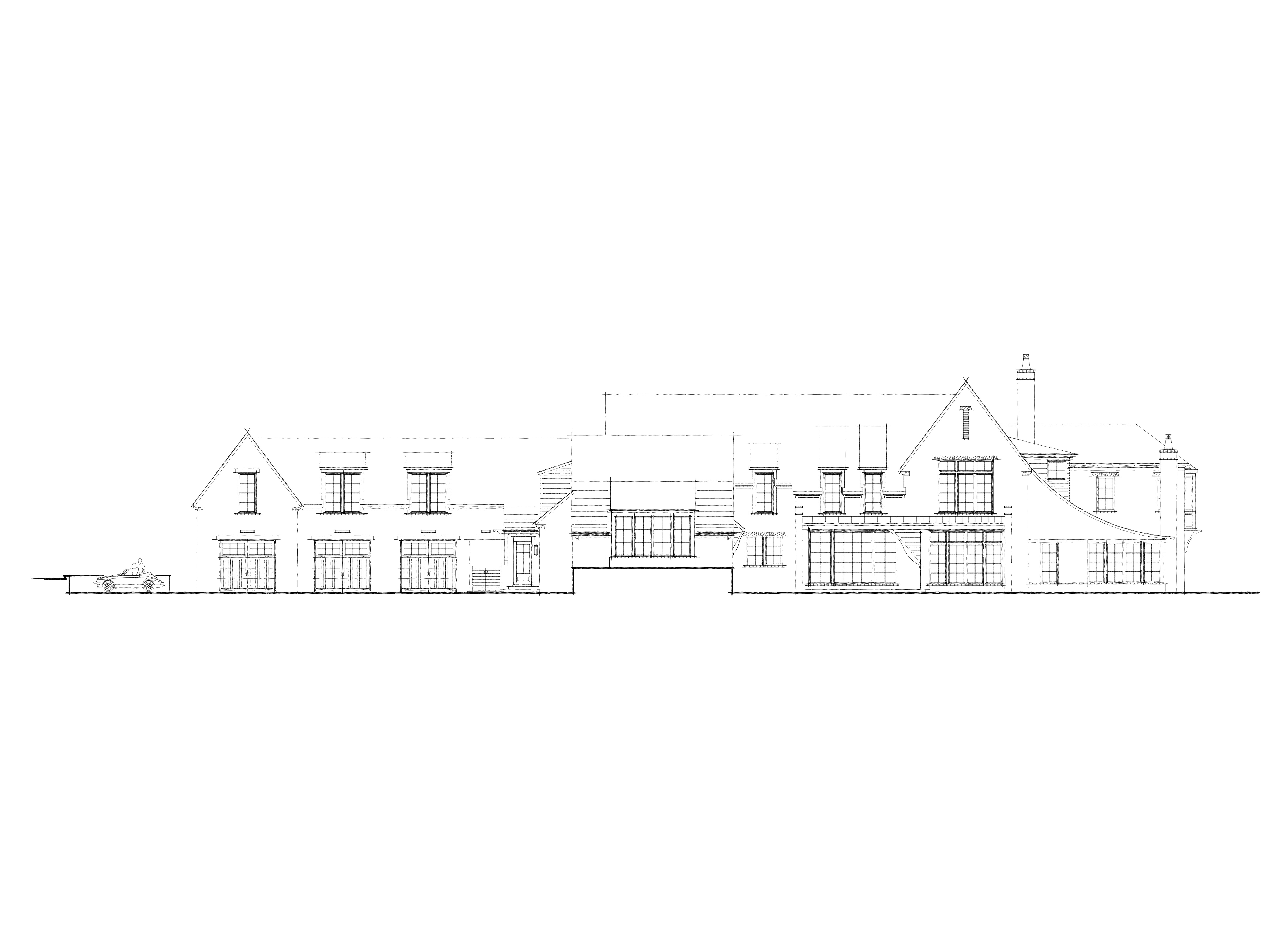 create a hand pencil sketch of the elevation adding shadows and roof textures do not change the architecture design do not modify and linework add landscape in front of the building and trees behind the building