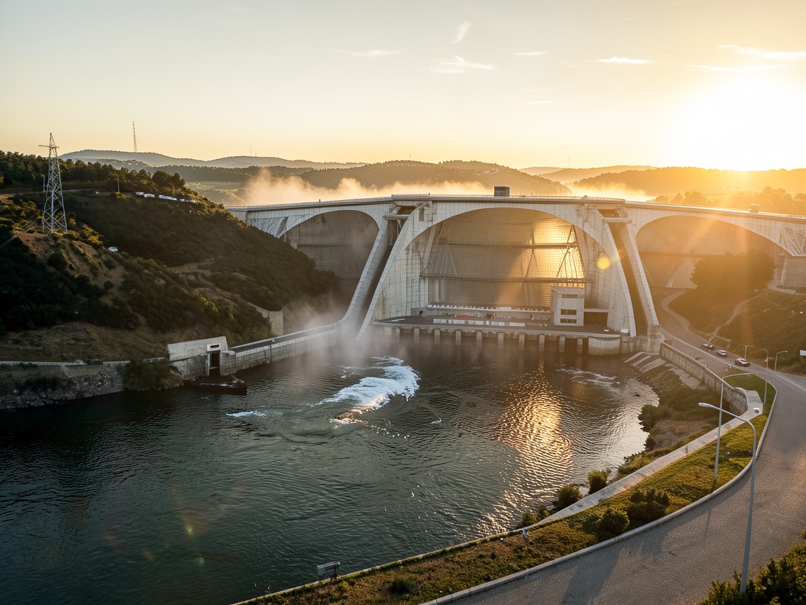 transform the provided 2d image into a cinematic architectural visualization of the future girabolhos dam in portugal begin with a wide aerial view of the surrounding natural landscape slowly revealing the full scale of the dam integrated into the valley camera movement should be smooth and deliberate resembling a stabilized drone shot gradually approaching the structure to emphasize its magnitude engineering precision and strategic importance set the scene at early golden hour with soft sunlight reflecting on the water realistic shadows subtle atmospheric haze and gentle mist near the dam wall animate the water with calm but continuous movement reinforcing the idea of controlled power and sustainability visual style realistic cinematic institutional high end infrastructure presentation no people no text no logos ultra realistic lighting 4k quality