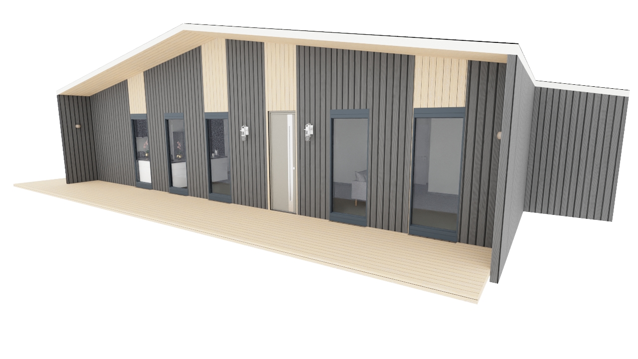 modern single story house with a slanted roof featuring vertical dark gray wood paneling the facade includes multiple large windows with dark frames enhancing a sleek contemporary aesthetic light beige wood is used for the roof interior and the desk flooring providing a warm contrast the atmosphere is serene and minimalistic set against a bright clear sky evoking a tranquil and inviting ambiance