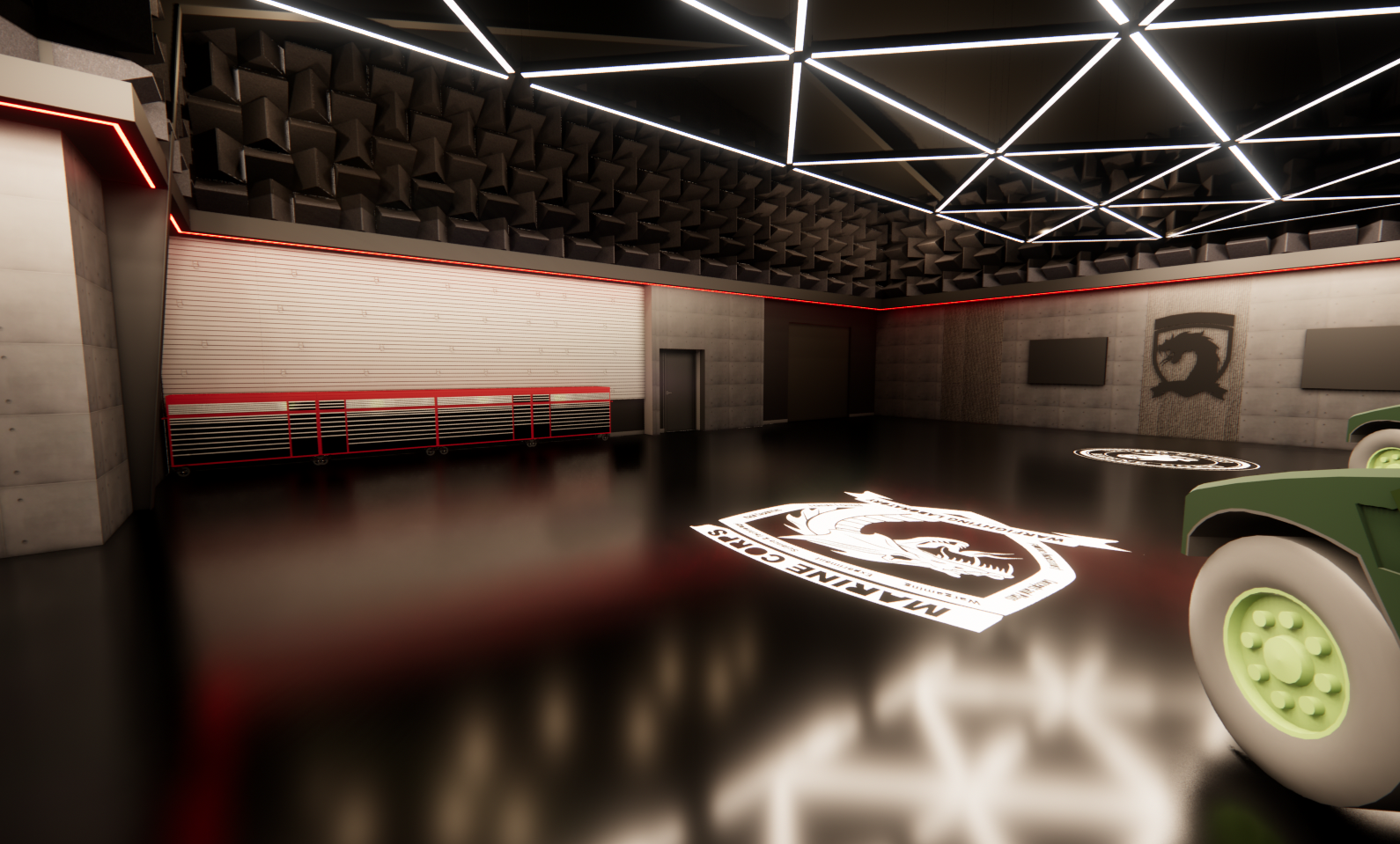 add tools on the white slat wall above the tool boxes add a polaris razr vehicle in front of the tool boxes add images to the tv s add military men and women walking around add men in suits walking around