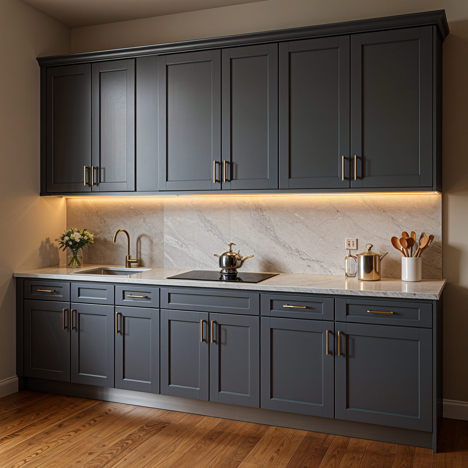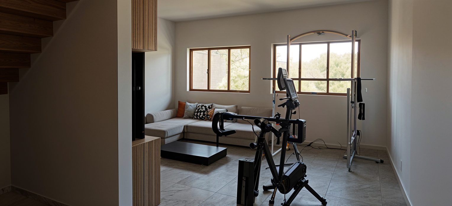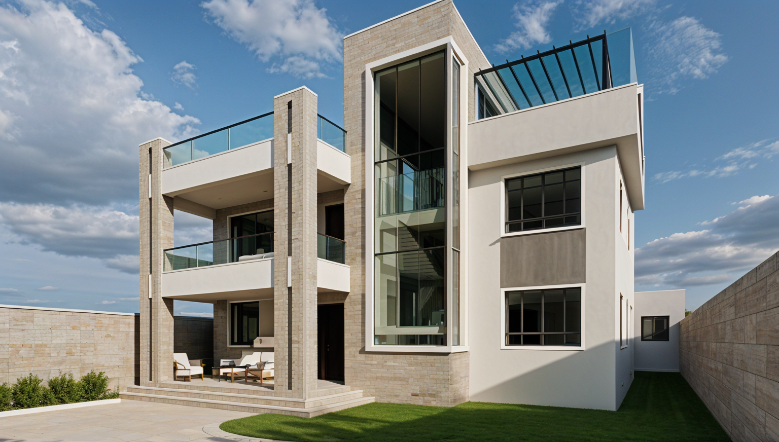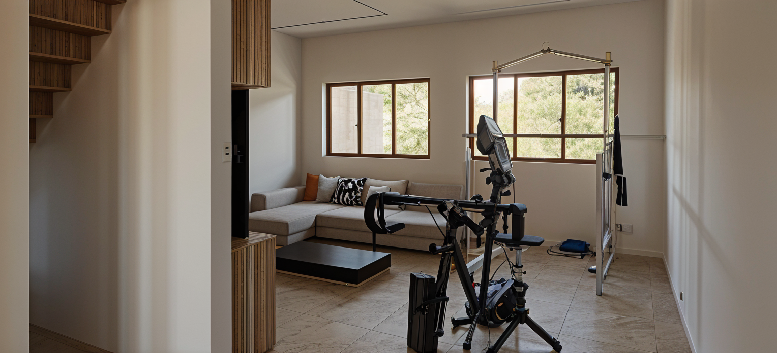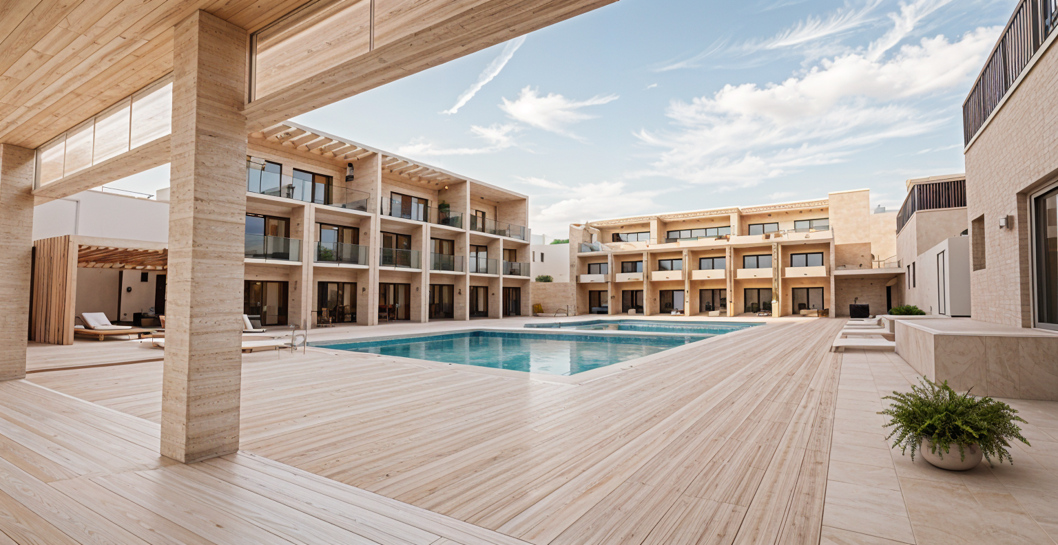 create photorealistic render of this living area adjacent to a center light well atrium which is open to below maintain colors as much as possible provide warm ambient light and natural light from the windows cabinet is walnut wood and tiles are 60x60 gray concrete tiles do not put cabinet lighting