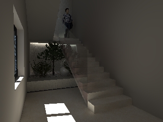 enhance the realism of this architectural rendering by improving lighting and shadows material and texture quality atmospheric depth and human scale elements focus strictly on photorealistic refinement of what is already present in the image do not add remove or invent any architectural elements furniture or objects that are not already visible preserve the original design intent spatial composition color palette and layout exactly as provided enhance the existing plants add some new green plants and white medium pebbles turn on the white balllights add a soft warm light coming from under the planter
