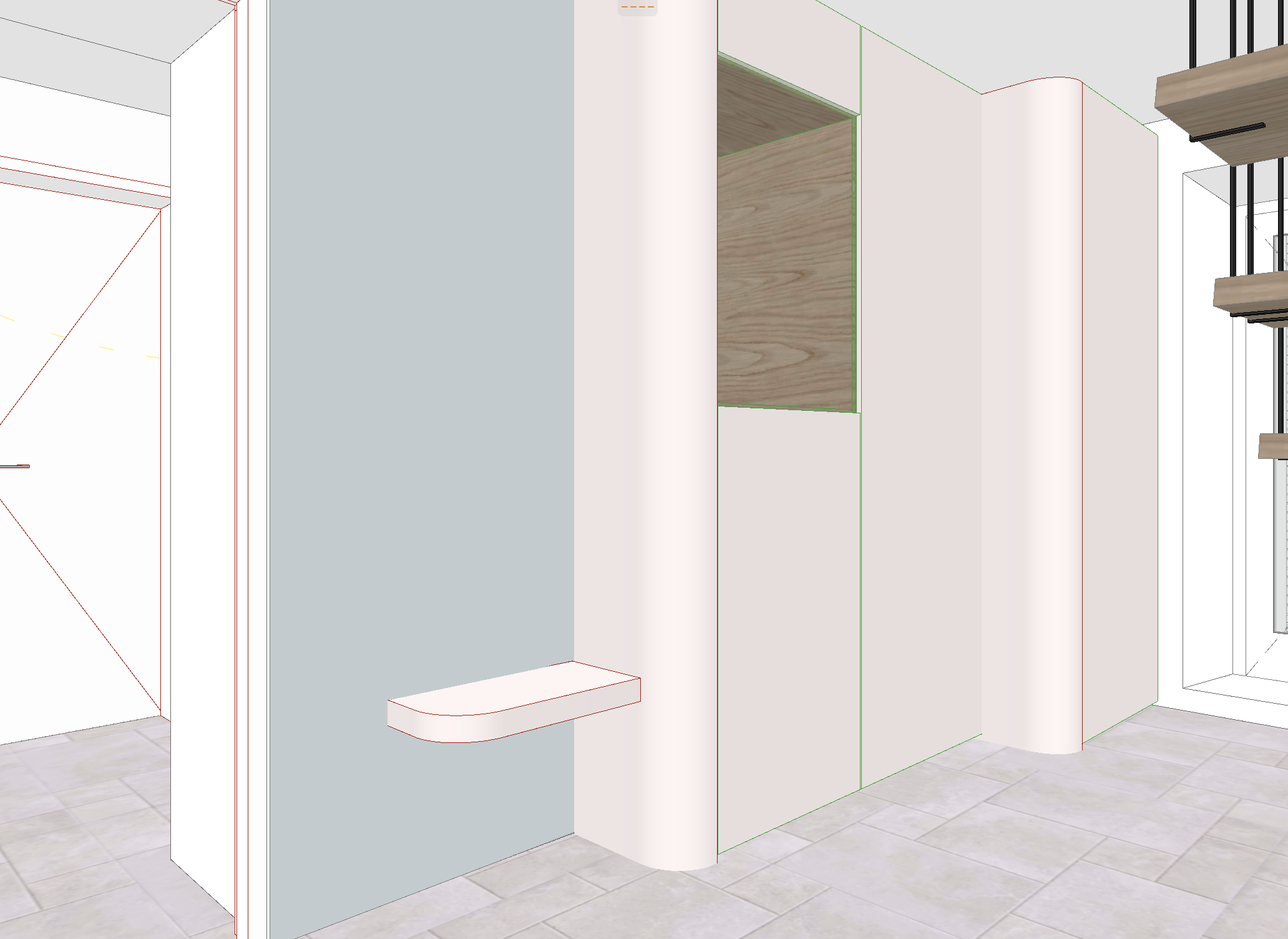 hallway in a mediterranean house matte polished mediterranean grey stone flooring floor to ceiling mirror on the accent wall with small wooden bench in front of it continuing with a wardrobe with a wooden framed niche and off white fronts serene atmosphere and daylight coming in through the front door walls in off white colour