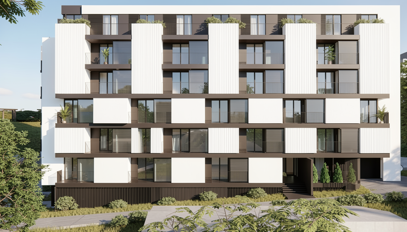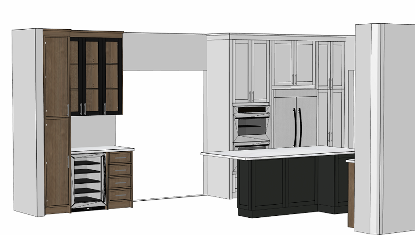 render a modern kitchen with sleek minimalist design cabinets are a soft elegant beige with a matte finish the lower cabinets and drawers are a rich dark walnut wood with a polished sheen the island is a dark painted charcoal colour the countertop is a pristine white marble with subtle gray and gold veining walls are painted in a warm inviting light gray natural light streams through large windows creating a bright and airy atmosphere the overall ambiance is modern calm and sophisticated