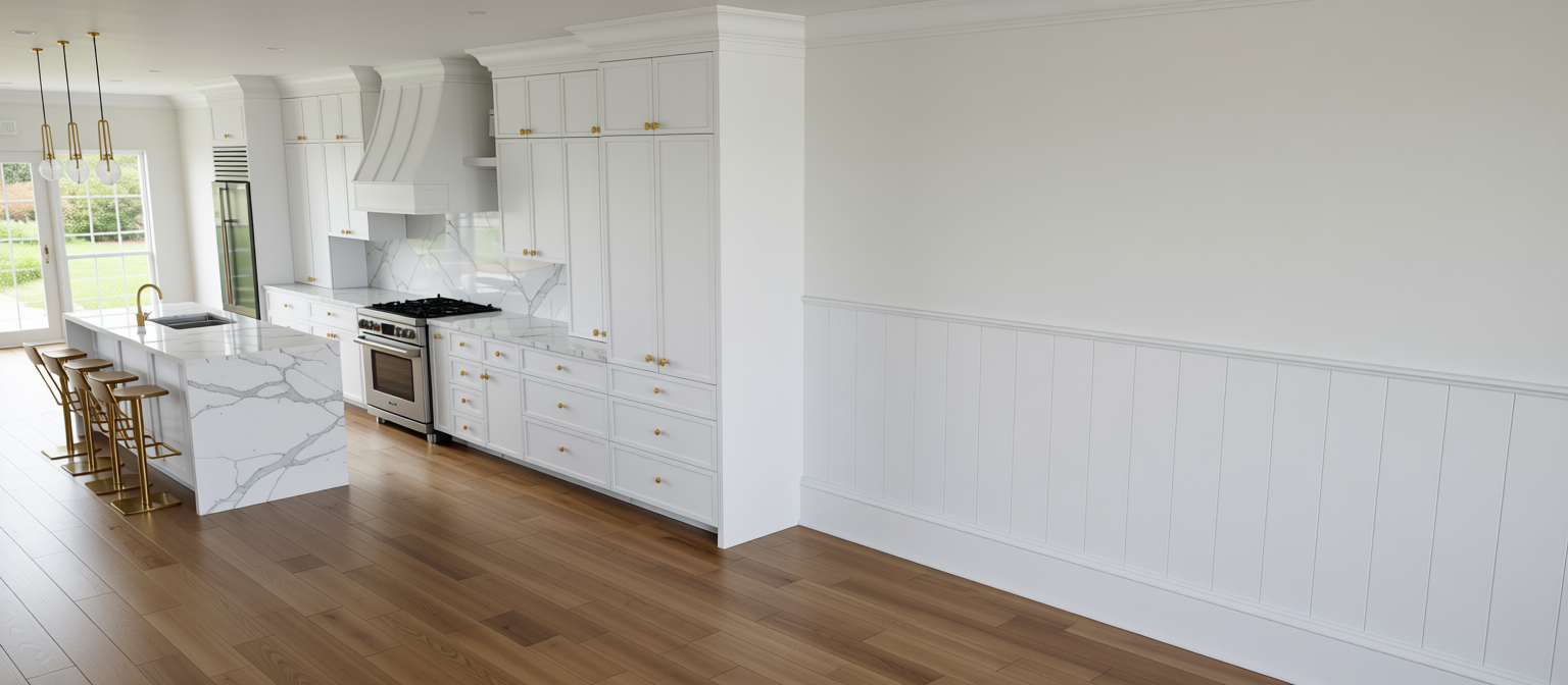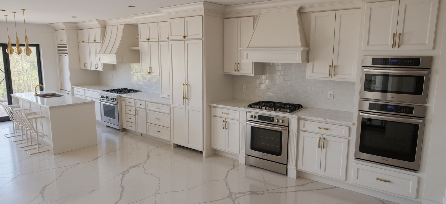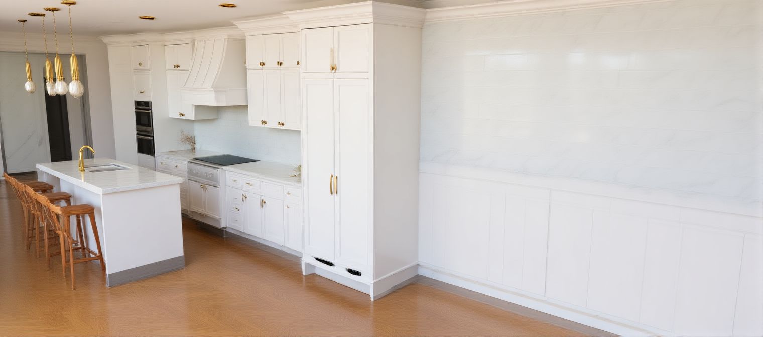 render it with white cabinet gold hardware white marble countertop