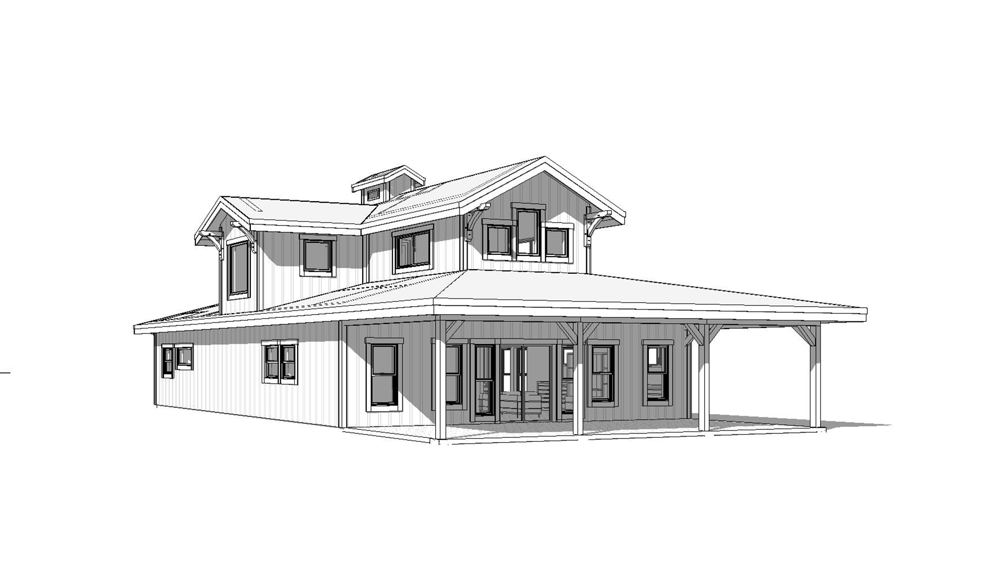 back view of a clean rustic barn home architectural exterior home rendered in cinematic daylight lighting with bits of blue skies and sunlight coming through the clouds barn home in a lush beautiful colorado countryside with green grass hills and a faint hint of a mountain range in the far distance in the background warm glow and reflections off of the windows select grade vertical wood siding green manicured landscape around structure with gardens and patches of grass black standing seam metal roof high fidelity photorealistic visualization crisp shadow falloff refined facade geometry soft atmospheric depth premium architectural photography mood ultra clean composition and materials photorealistic render add black trim around the windows and doors prominent trees scattered around the property