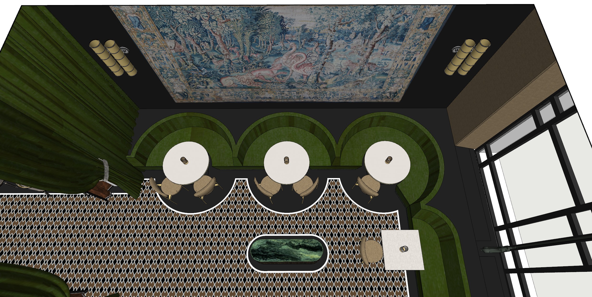 warm natural and indirect lighting the walls are painted white the floor is a bespoke carpet the chairs are in fabric the frames are acrylic paintings the table lamps light up and down there are oriented spotloghts fixed to the ceiling large windows with natural light the bamboo sconces lit up and down the seatings are in green velvet there is an ancient tapestry hanging on the wall the round tables are in white marble