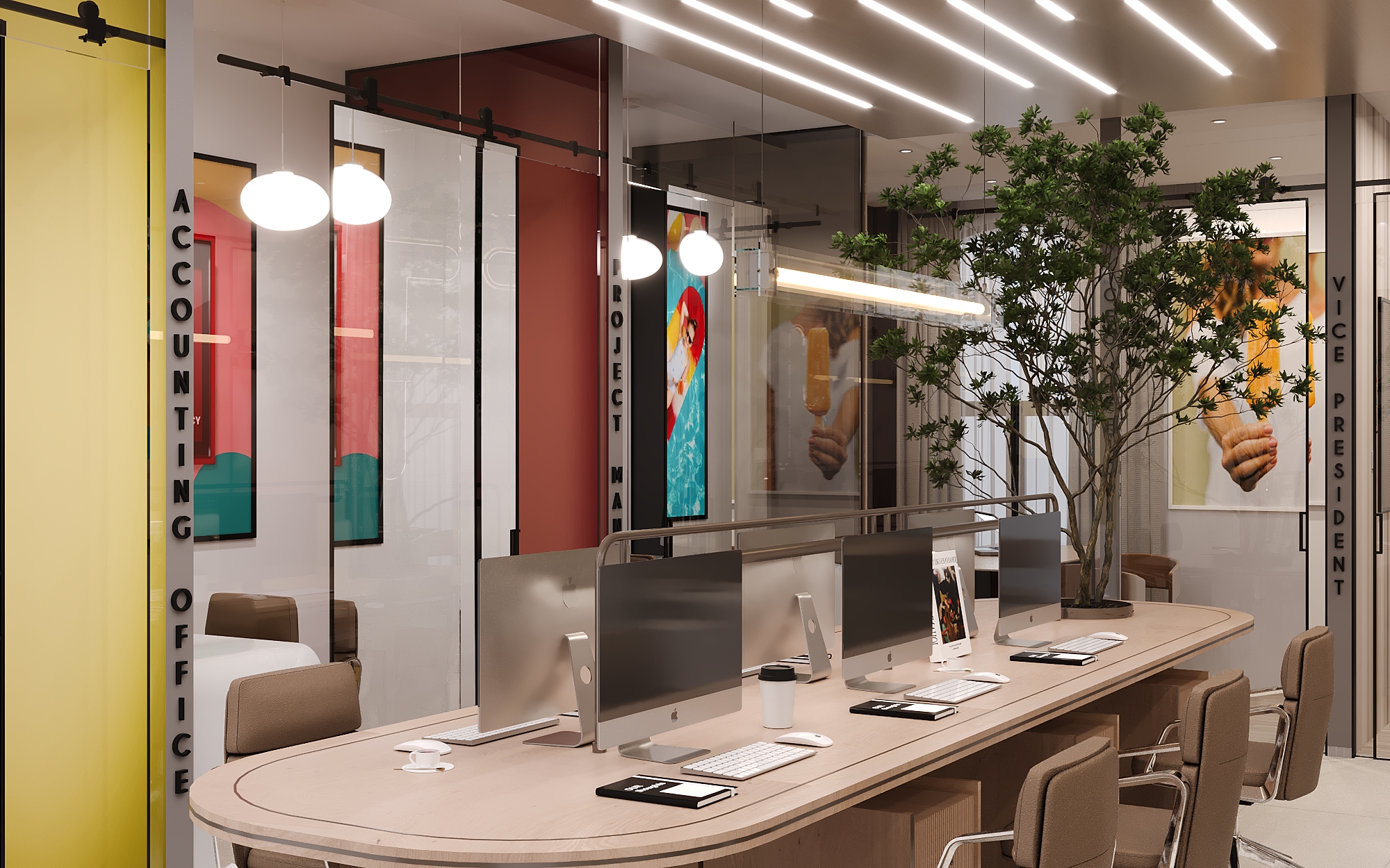 render a modern office space with sleek and sophisticated design the open plan layout features glass partitions with labels like accounting office and vice president in bold black letters the walls are adorned with vibrant artwork in colors of teal red pink and yellow adding a creative flair the workspace is illuminated by modern linear ceiling lights casting a soft inviting glow the desks are a light natural wood accompanied by brown fabric office chairs lush green potted plants add a touch of nature enhancing the lively professional atmosphere overall the color palette includes warm earth tones vibrant accents and metallic neutrals creating a harmonious and energizing environment