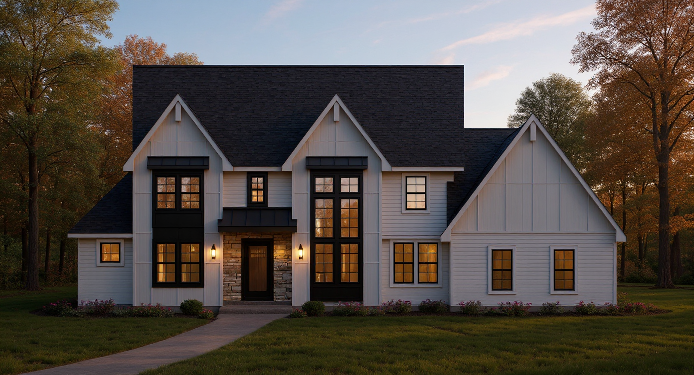 modernist exterior shot visualize a modern residential building with a contemporary design the building should have white exterior walls with black accents and black roof large windows with reflective glass and sleek black accents along the edges the atmosphere should be light and airy with clear blue skies and soft sunlight casting soft shadows from the front the surrounding landscape should include lush green grass colorful flowering shrubs and tall deciduous trees with autumn colored leaves architecture