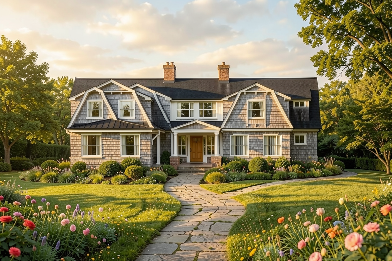 new building in beige add plants near the wall warm tones at gonden hour with soft shadows