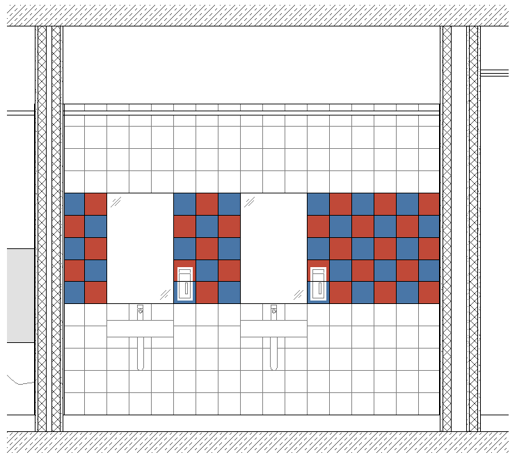 create a realistic rendering of an existing image of a wc anteroom apply highly realistic textures to all surfaces the tile colors must remain exactly as in the original image pay special attention to the tiles at mirror height they should have a red and blue checkerboard pattern and the colors must be preserved accurately the mirror should look realistic with natural reflections and lighting the washbasin should also appear realistic with detailed ceramic material and subtle reflections ensure the entire scene maintains a consistent lifelike appearance architecture