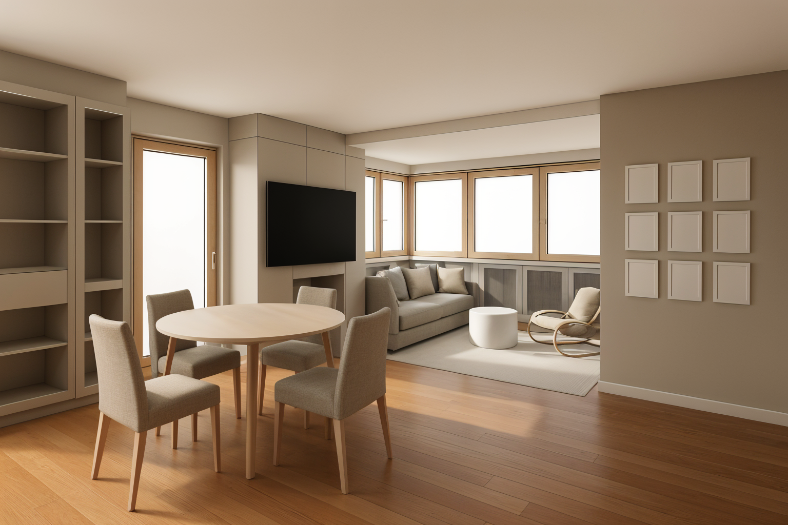 zaha hadid interior shot designed by interior shot prompt render a luxurious modern living space with a calm sophisticated atmosphere use a neutral color palette with beige walls and light wooden floors incorporate a curved sectional sofa in light gray with brown and ivory cushions placed around a circular textured taupe rug add a modern floor lamp with a white sculptural shade beside the sofa integrate dark wooden elements for the dining table and chairs providing contrast create soft ambient lighting on the ceiling to enhance the cozy ambiance include marble textures on the wall separating the living and sleeping area maintaining a seamless transition ensure the overall mood is warm inviting and elegantly minimalist style realistic lighting soft ambient color palette neutral beige light gray brown taupe ivory architecture architecture