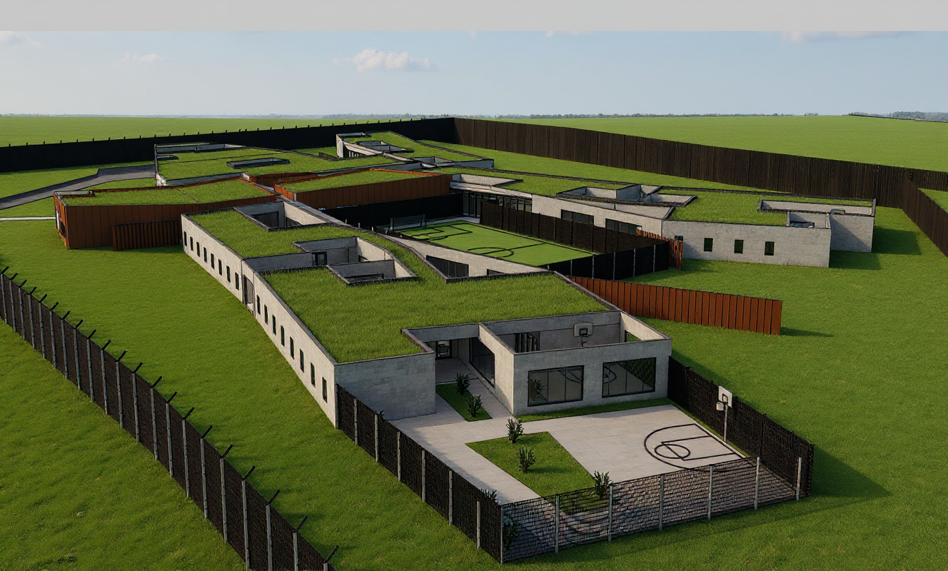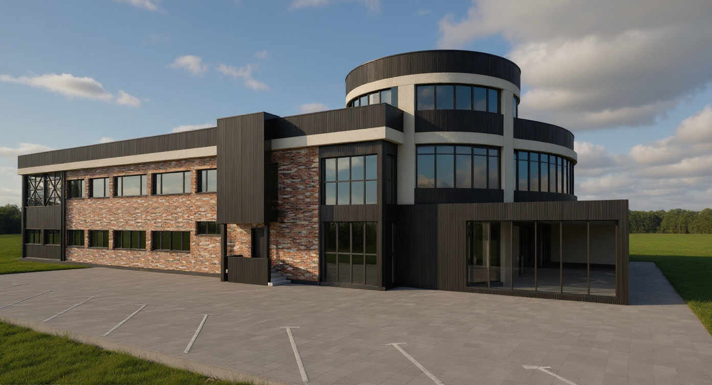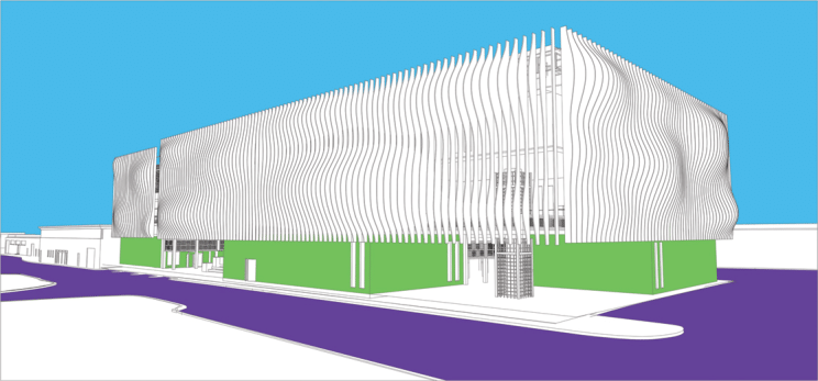 render this to a realistic quality those wavy facade patterns should be made to look like its out of wood any purple is a nearby road any green should be a darker staggered stone texture the blue is the sky add shading and light behind the facade add details to the sky remember realistic quality