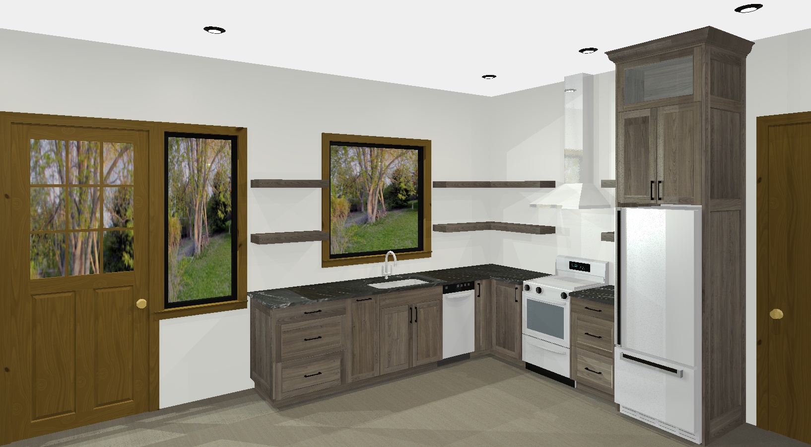 cabinetry is a sage green paint stove is a white summit brand gas refrigerator is fisher paykel 13 5 cu ft series 5 hood and dishwasher are stainless steel flooring is a light rustic white oak