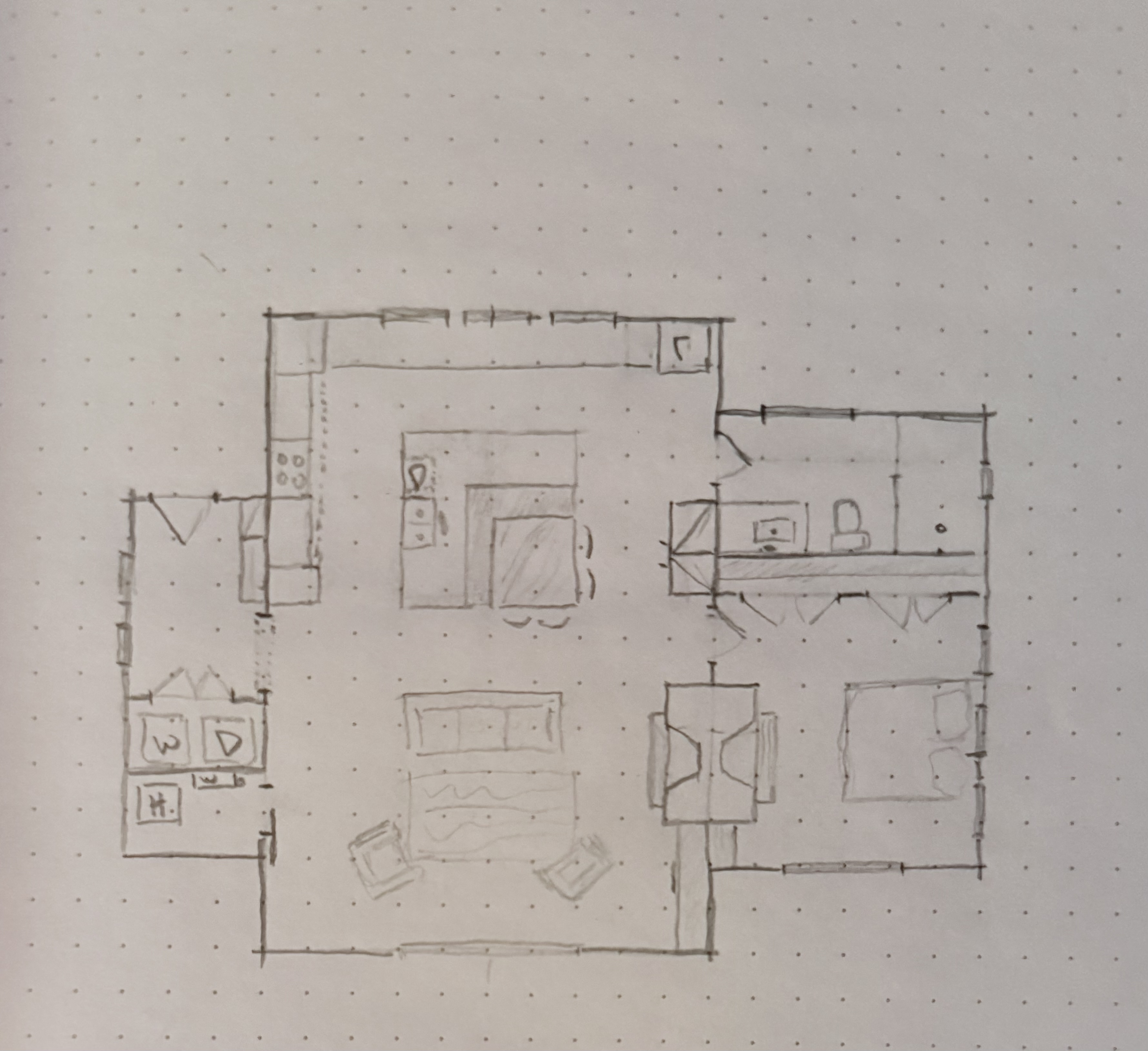 exterior shot create a beautifully rendered top down view of a modern home based on a sketched floor plan the living room features a cozy atmosphere with soft beige walls and a plush gray sofa the kitchen has sleek white cabinets and stainless steel appliances paired with a polished warm oak wooden floor the bedroom showcases a calming atmosphere with light blue walls and a soft cream colored bedspread the bathroom exudes a fresh vibe with light gray tiling and white fixtures the overall atmosphere is warm and inviting with natural light flooding through large windows accentuating the space with a comfortable and cottage feel keep the original layout design and do not change any details
