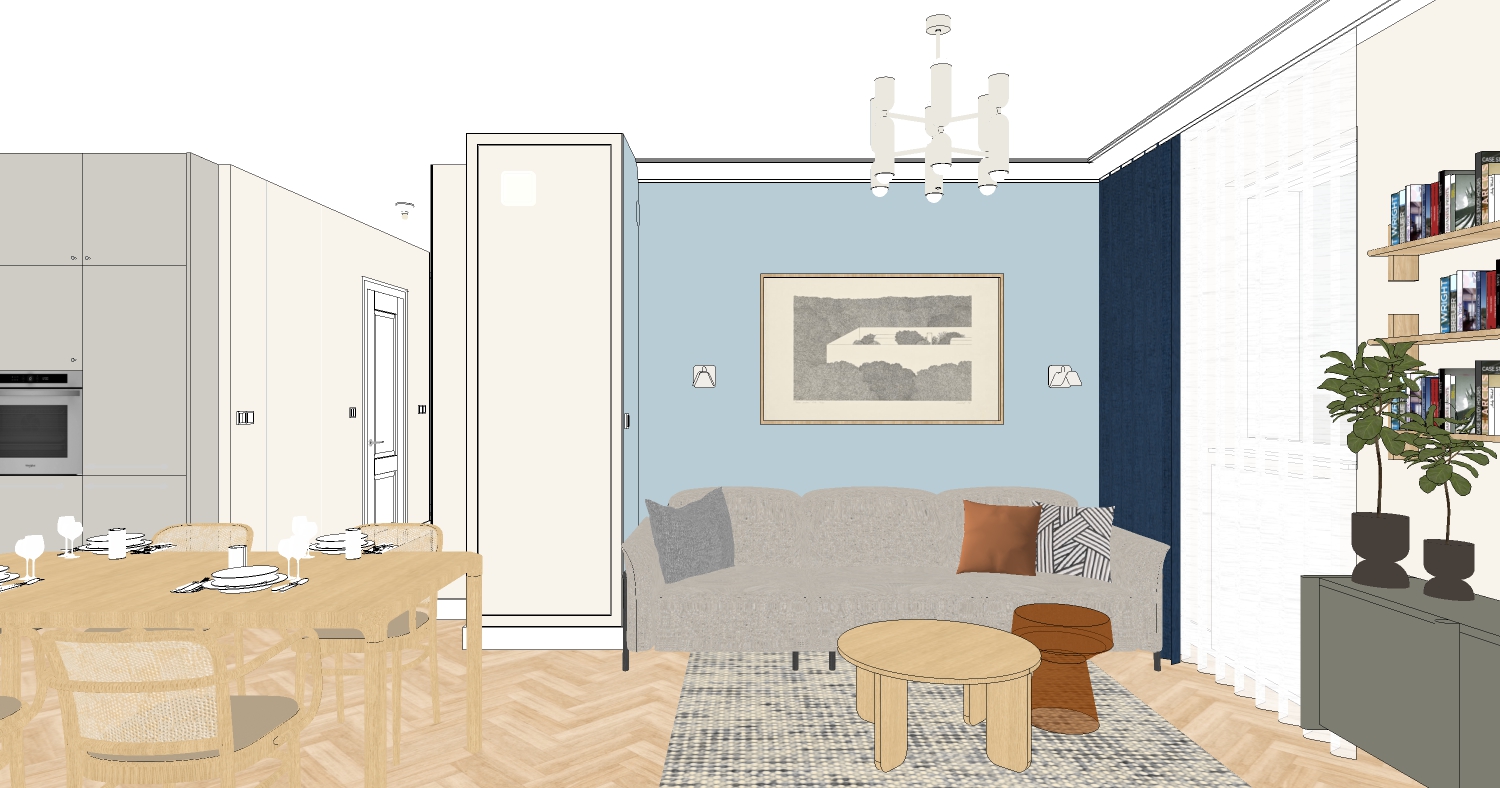 generate a realistic interior in a modern style with bright natural daylight lighting do not change any existing elements or color schemes the furniture should remain semi matte the upper part in a cashmere color with a slight rounding at the end the lower part of the cabinets made of oak veneer the flooring materials remain the same with tiles in the kitchen area as visible in the photo add lighting while maintaining coherence and realism throughout on the ceiling keep the small white flush ceiling fixtures model gx53 grandi ip54 from led hurt https led hurt pl pl p oprawa sufitowa natynkowa gx53 grandi ip54 okragla biala 6690 do not change them the whole should look modern elegant and natural with realistic daylight lighting soft reflections and semi matte surface finishes do not change any lamps and colours they should remain as they are the lamp should be lit and cast the light in the room do not added any lamps add light to ceiling lamps don t added any new light and dont changes the wall colors