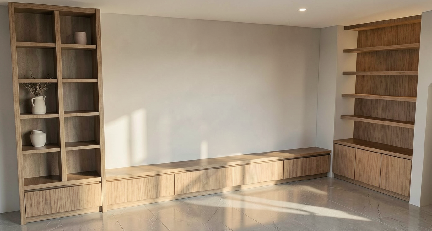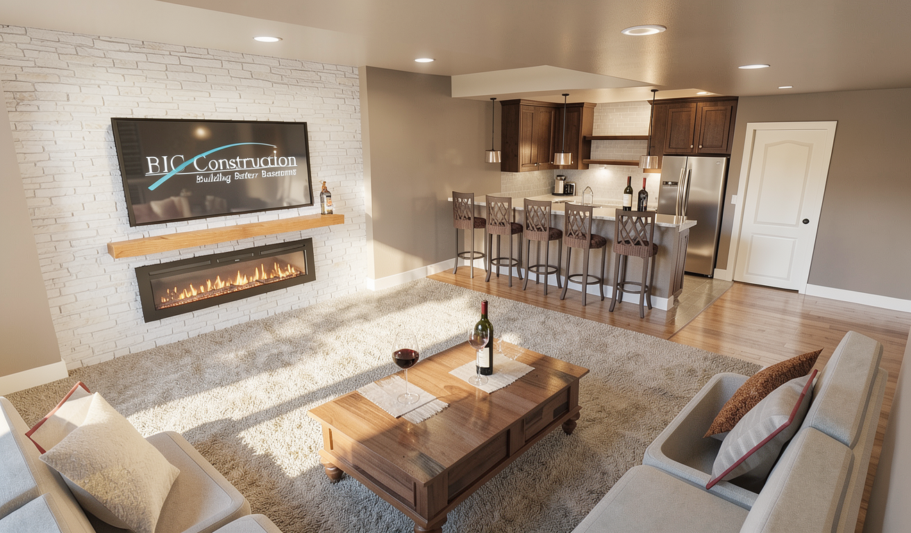 change the black lettering on the tv bic construction building better basements with the light blue swipe through it to white lettering make the carpet low pile pattern and add some light additional furnishings and show only two wine glasses and a bottle of wine on the bar top change the stone behind the tv to white brick set 3 x6 white washed bricks