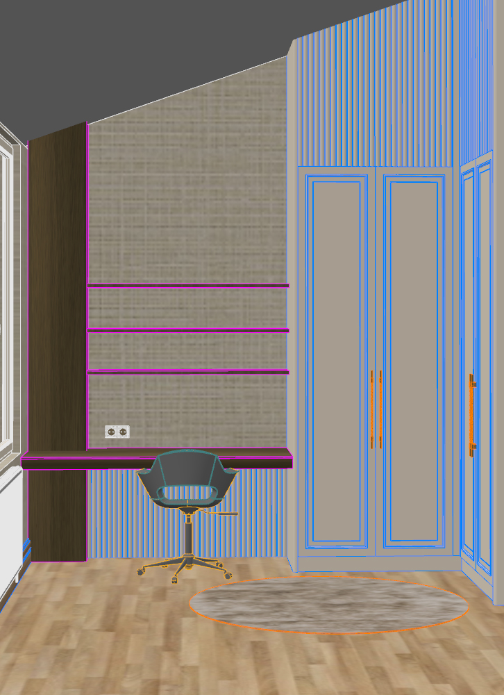 let there be led lighting on the ceiling there should be a laptop in front of the outlet the cabinet models should remain the same the handle color should be matte bronze