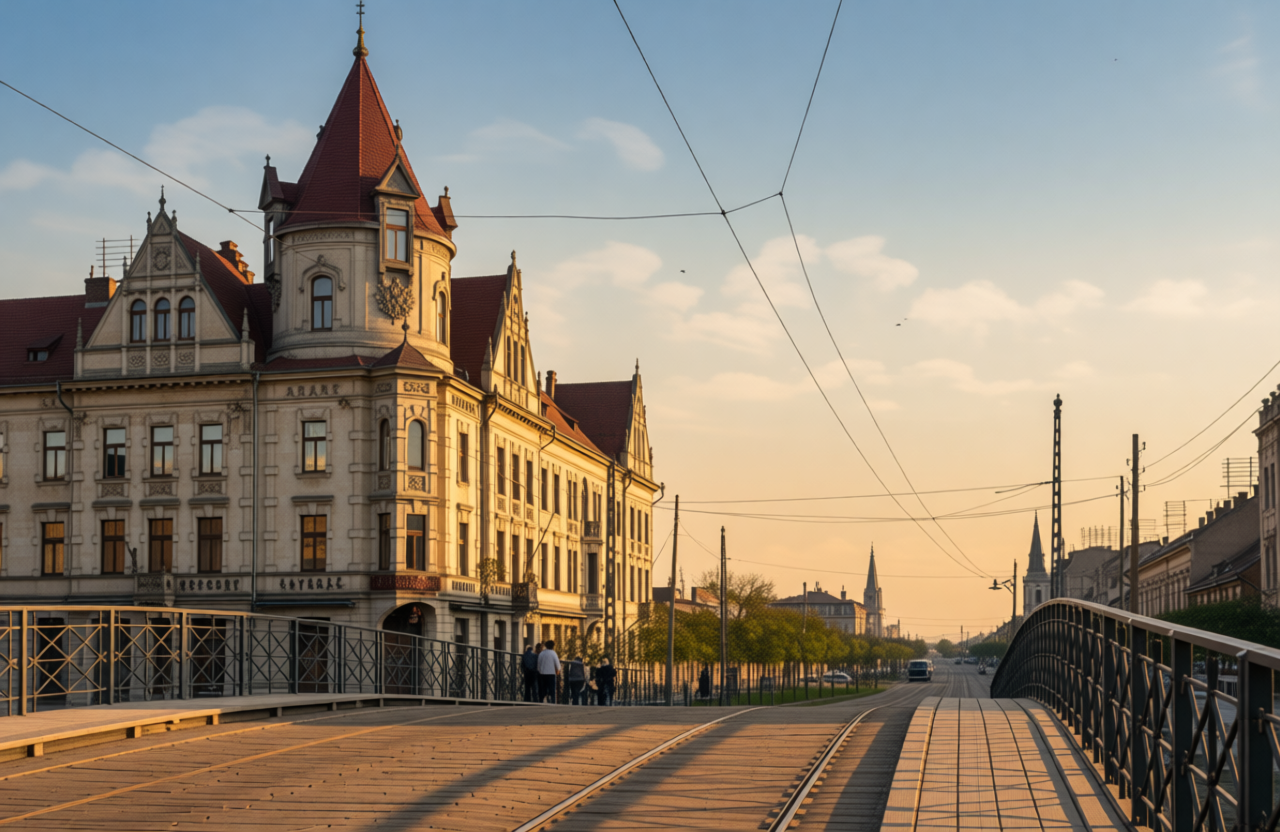 remove red text old cars 1910 s atmosphere no cars on the street dark grey tower roof keep shape and architecture of the reference image winter mood without snow