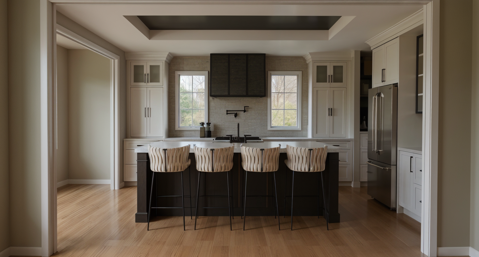 modernist exterior shot turn this architectural drawing into a beautiful 3d render of a 3 story building the windows should be large with black matte framing the doors should be a nice wood color to compliment the white and gray colors of the sleek building add a gray concrete ramp with railings at the front of the building for accessibility add lush greenery surrounding the building but not too much the day is bright and sunny architecture