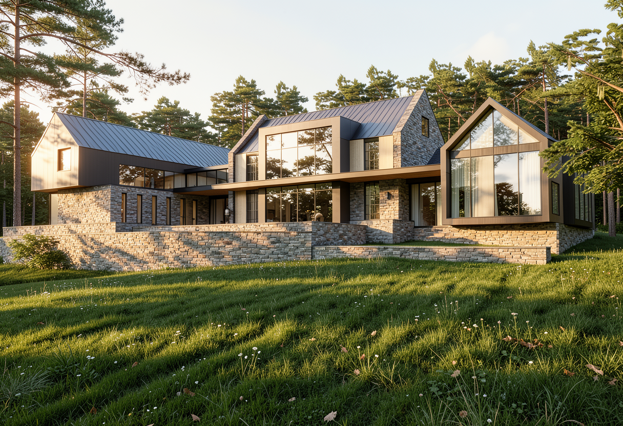 realistic perspective of tennessee modern home keep materials stone accent forest