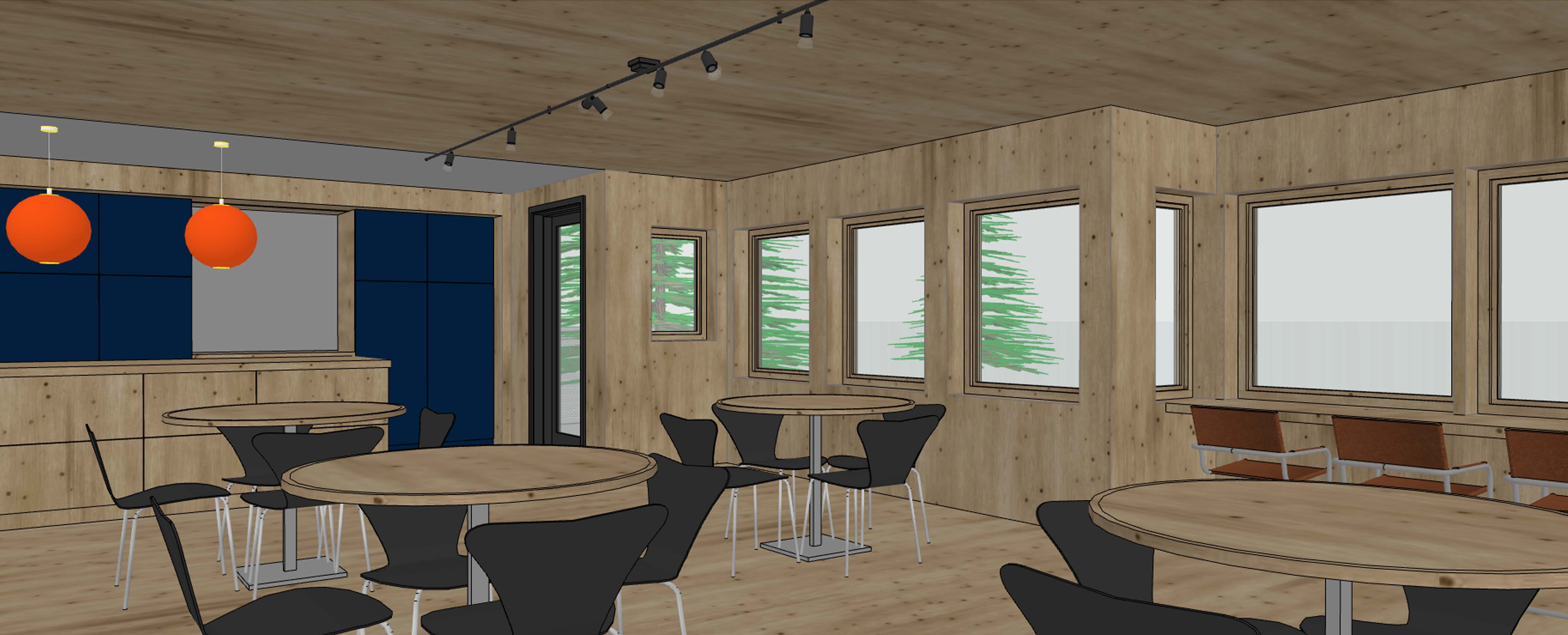 a warm modern restaurant in a ski area people drinking hot coffee and enjoying themselves inside wood walls and ceiling modern lamps on the wall and spotlights in ceiling dark blue kitchen in the back of the room