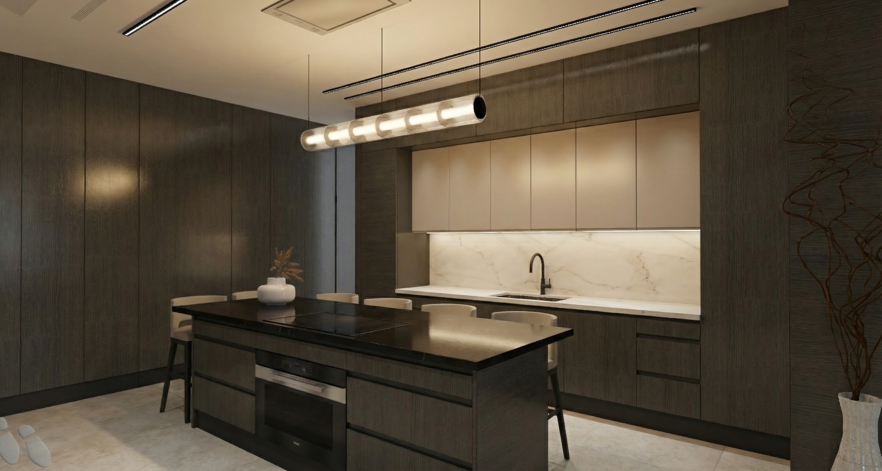 e una sala per cene luce soffusa a terra abbiamo un pavimento in parquet in rovere chiaro continuo e liscio la cucina ha una strip led sotto i pensili e il fondo in piastrelle verde opaco in rilievo leggermente bombate non c la strip led nello zoccolo della cucina nella parete di destra dipinto un arco verde al centro abbiamo una tavola con il piano in marmo calacatta e gambe in ferro nero sopra alla tavola ci sono delle lampade a sospensione in ceramica opaca verde e sono accese le sedie sono in legno di colore verde metti qualche piatto sparso sulla tavola per simulare una cena gi iniziata e qualche attrezzo sulla cucina luce serale