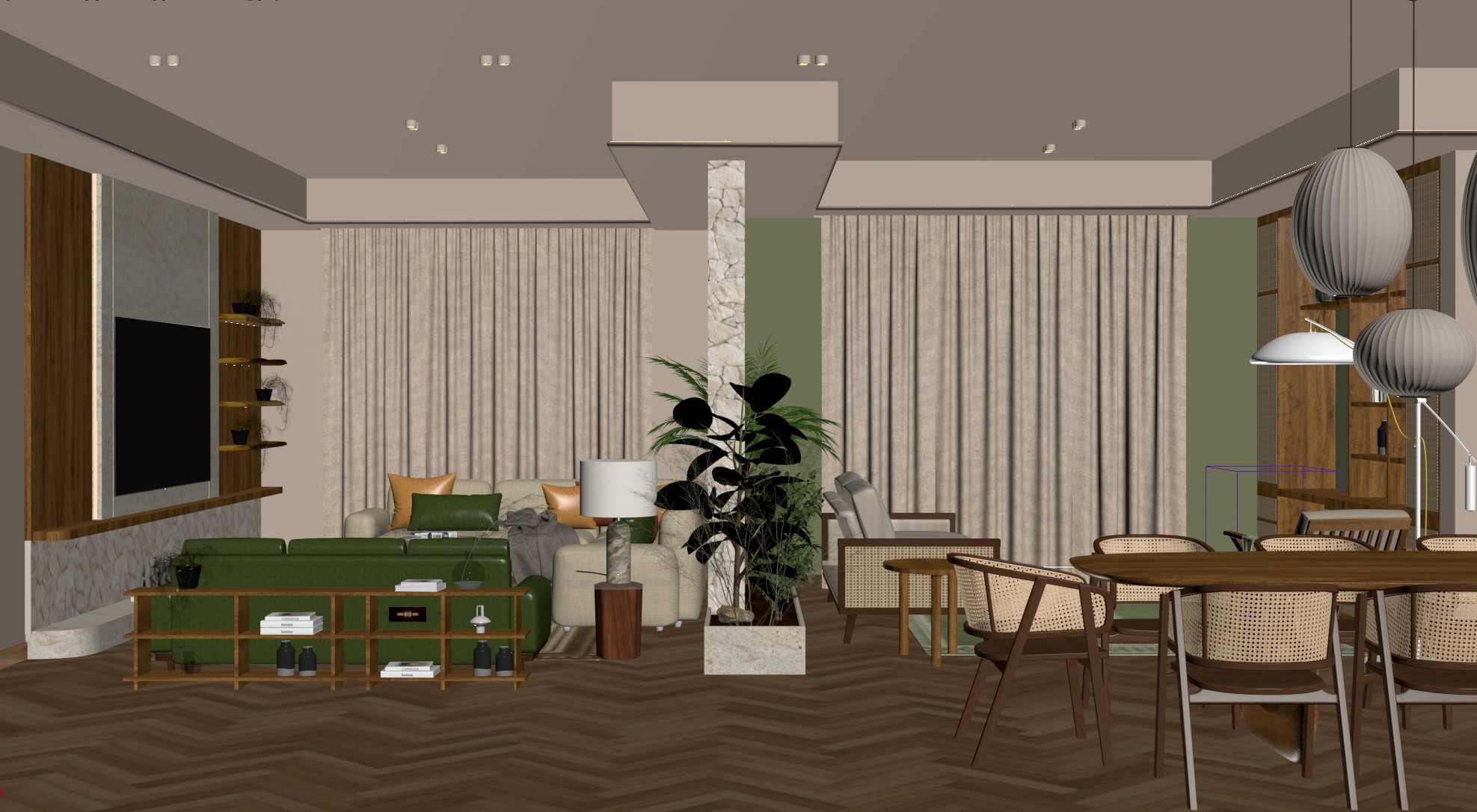 render a photorealistic 3d perspective of this interior living room with natural sun light from the window and see thru beige curtain bohemian style and organic fresh color visualization quality 8k resolution tv wall same material keep the spot light in ceiling add hidden light on the ceiling border