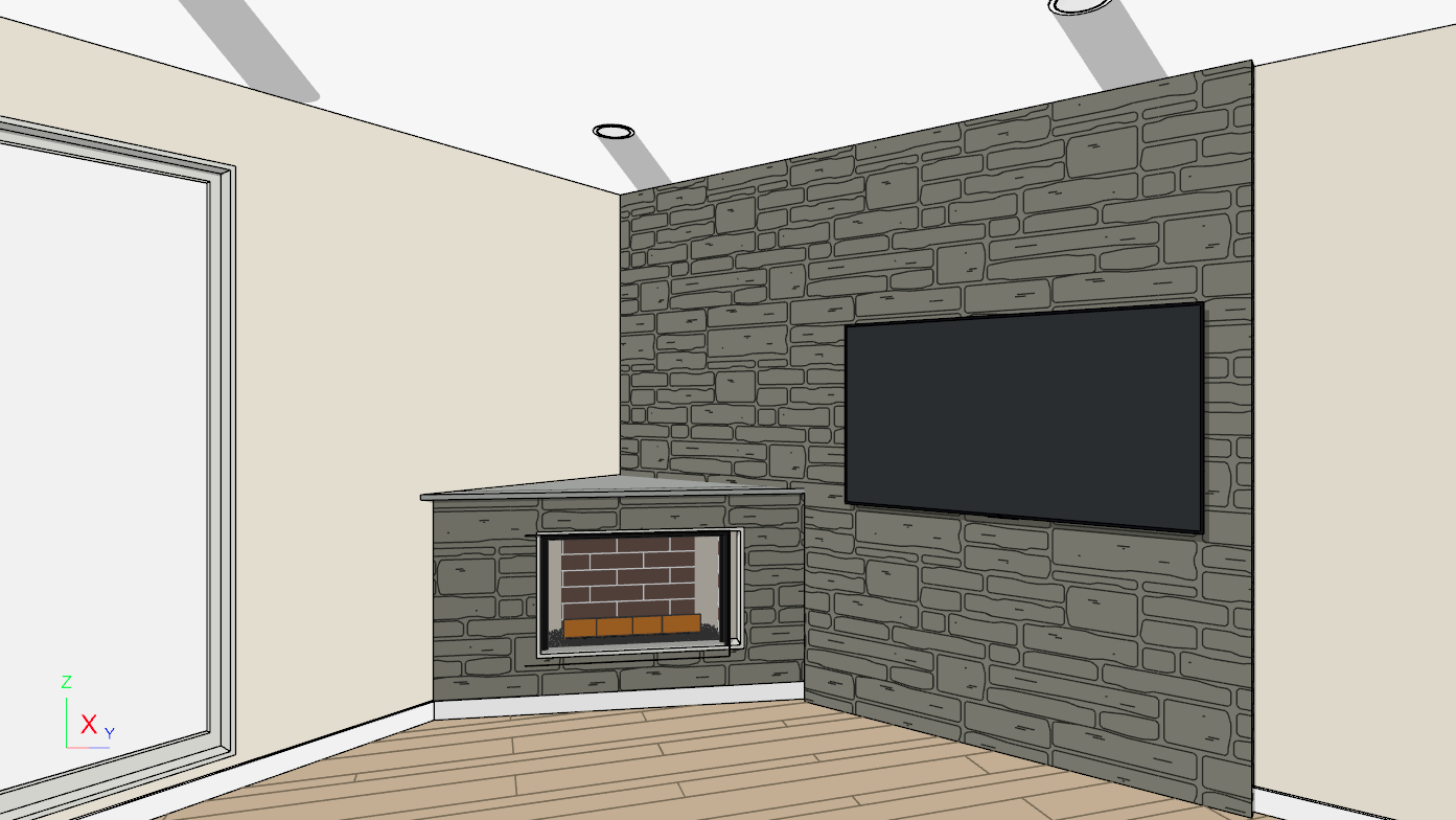 modernist interior shot finish this perspective photo there is ledgestone stone on the right wall and around the fireplace above the fireplace put some art or decorations the rectangle on the right in the stone is a wall mounted tv architecture