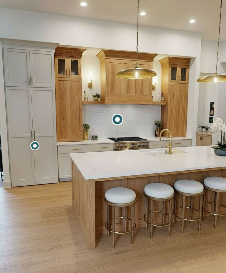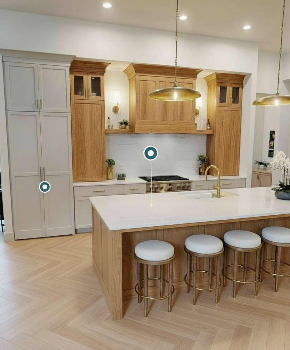 a beautifully rendered modern kitchen and dining area featuring white cabinetry and walls with a subtle light gray trim the backsplash and countertops are a crisp clean white the atmosphere is inviting and cozy a large wooden dining table with matching chairs is set on a vibrant blue rug with a geometric pattern there s a chandelier above the table casting a warm glow hardwood floors in a light oak finish extend throughout the space in the background stainless steel appliances complement the classic kitchen design the windows reveal a clear evening sky in calming blue tones