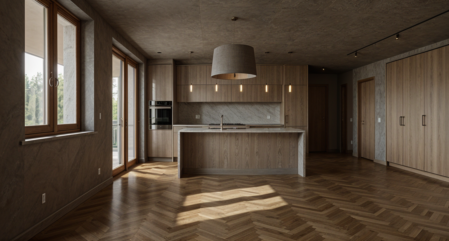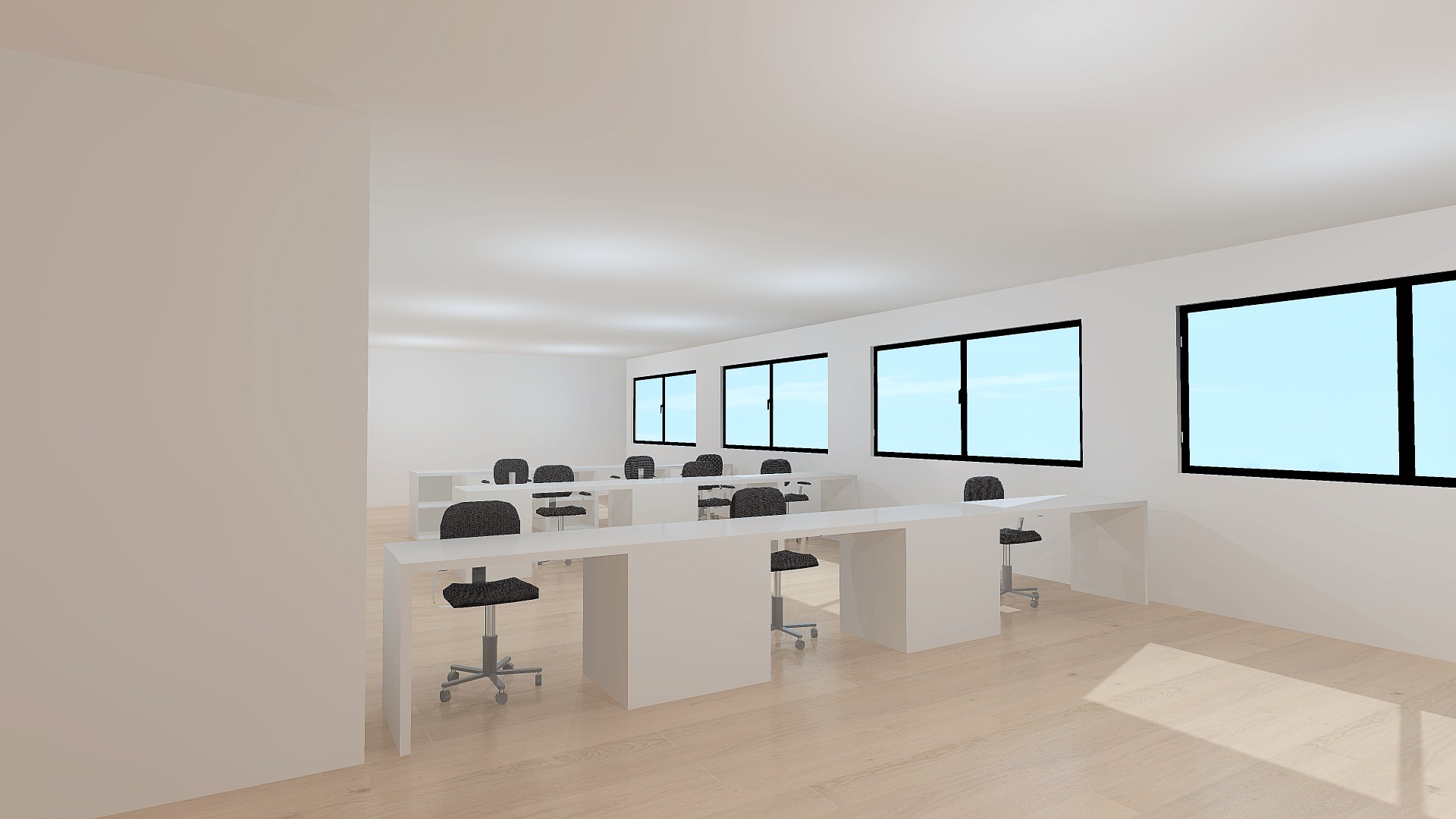 a spacious modern office space filled with natural light featuring sleek white walls and large windows with a soft sky blue reflecting outside the wooden flooring has a light natural oak tone creating a warm and inviting atmosphere minimalist white desks are evenly spaced with ergonomic black office chairs the overall ambiance is calm and professional with an open airy feel
