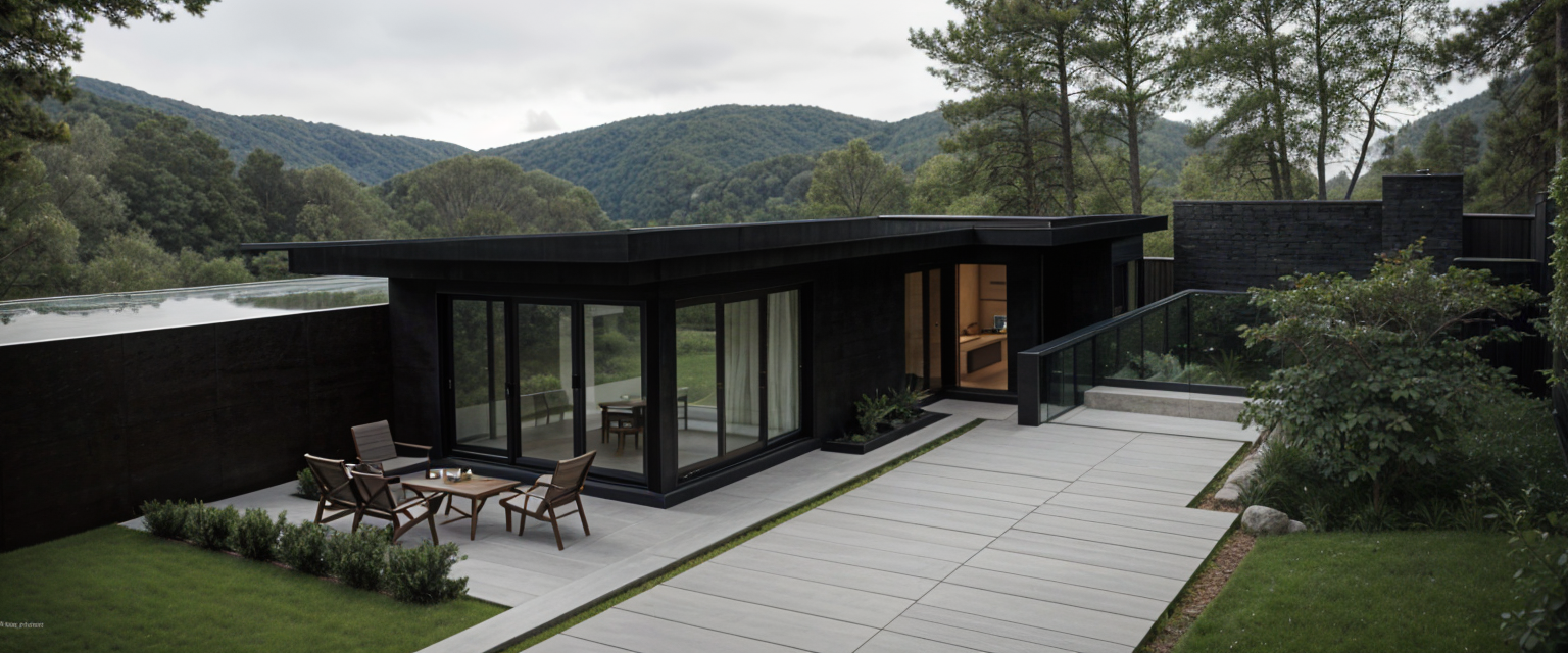 modernist exterior shot on a steep wooded hill tall trees surrounding house shou sugi ban architecture made from red brick