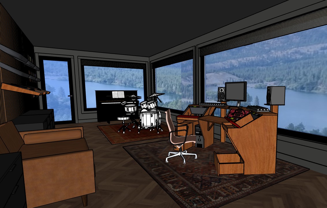 moody music studio with natural light in the view there is a recording board drumset and piano make sure that is translated correctly