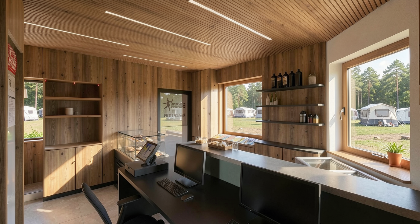 this floor plan is a top view perspective with a photorealistic look inside height 3 meters the windows are light the walls are white with a grey hatching on the floor drawing the tv wall has wooden covering lamellas the floor is grey office carpet the tables are light oak the chests are 90 cm high and white there are small green plants on the boxes the office chairs have grey upholstery one or two people can walk and sit
