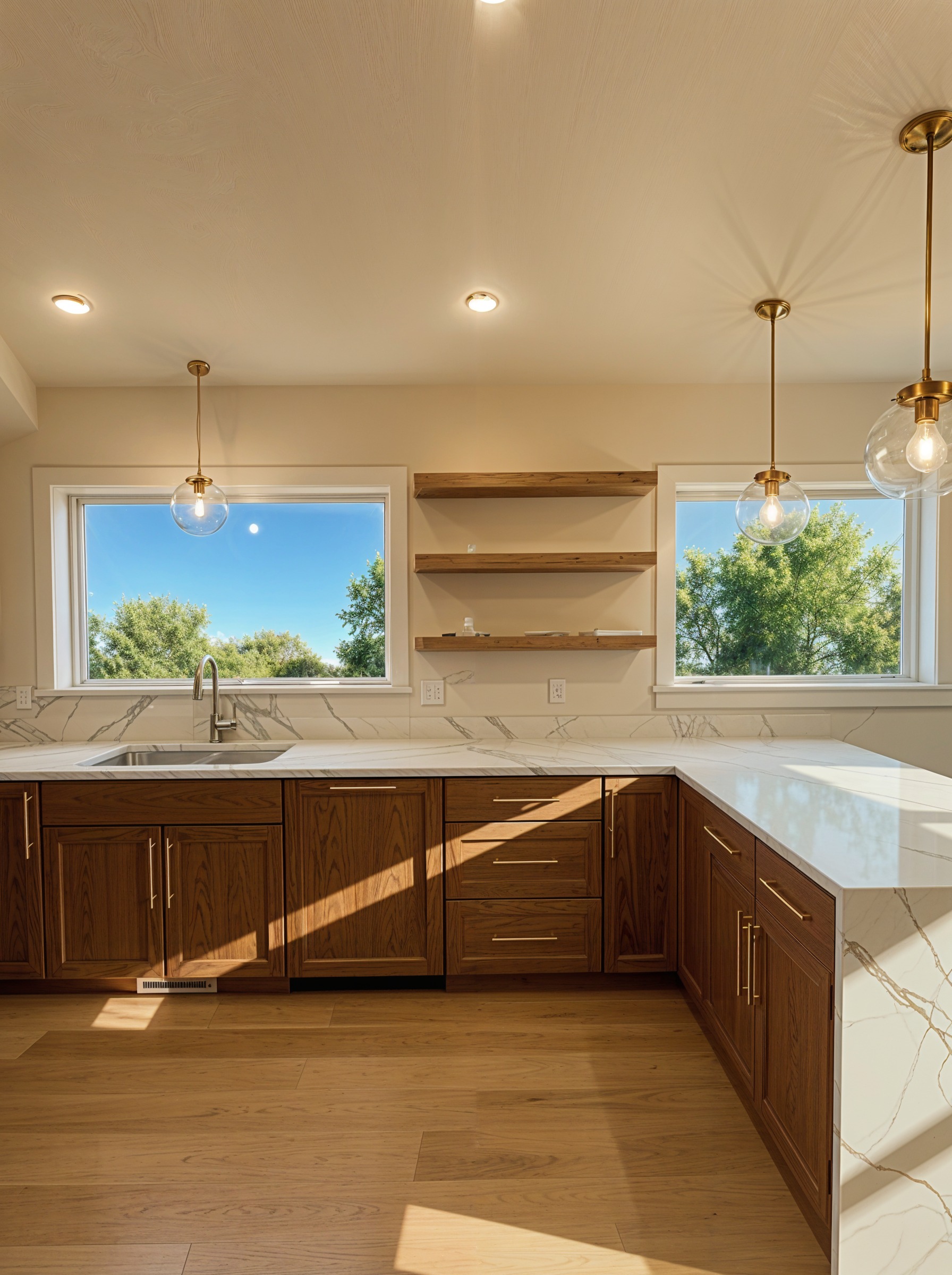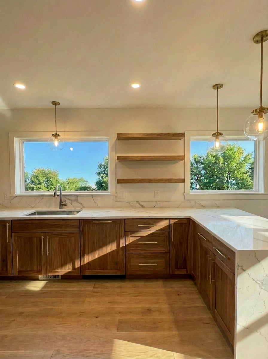 do not change the structure layout or window placement of this kitchen remove small items on the floating shelves and replace them with clear dishware small plant and a few books