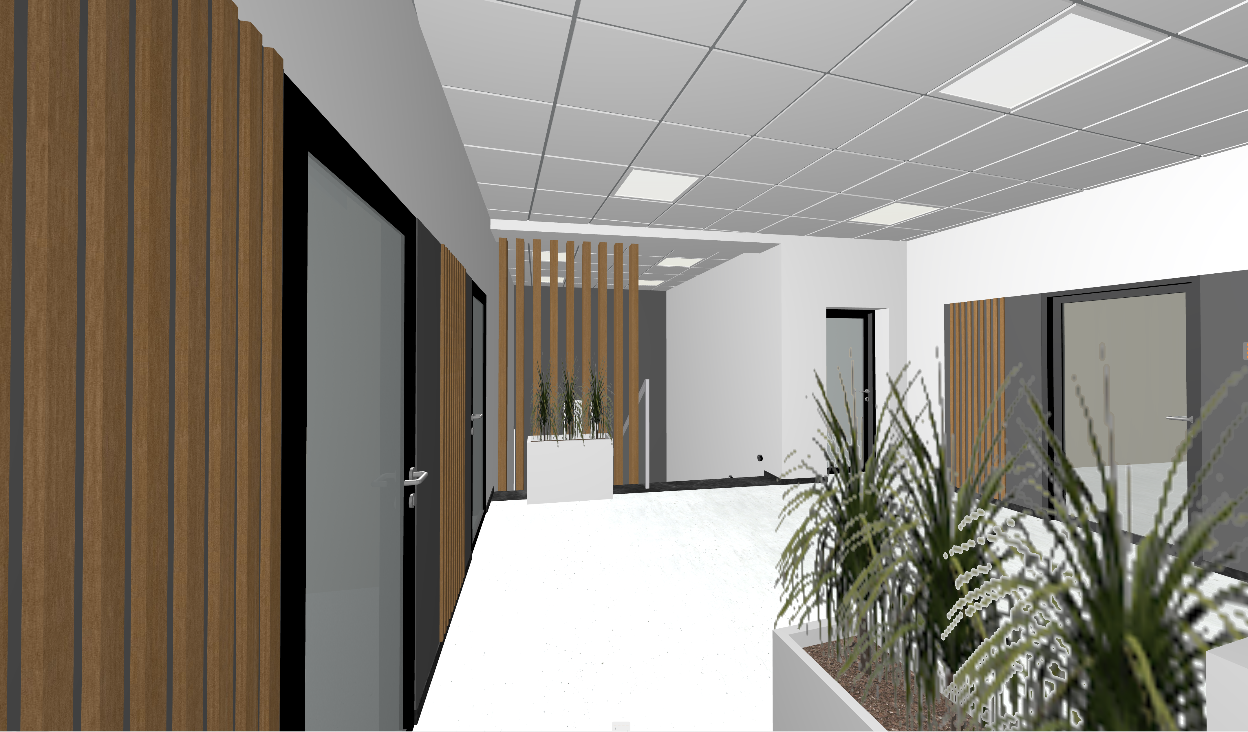 bright interior of the office corridor light concrete floor white and silver walls with wooden strips