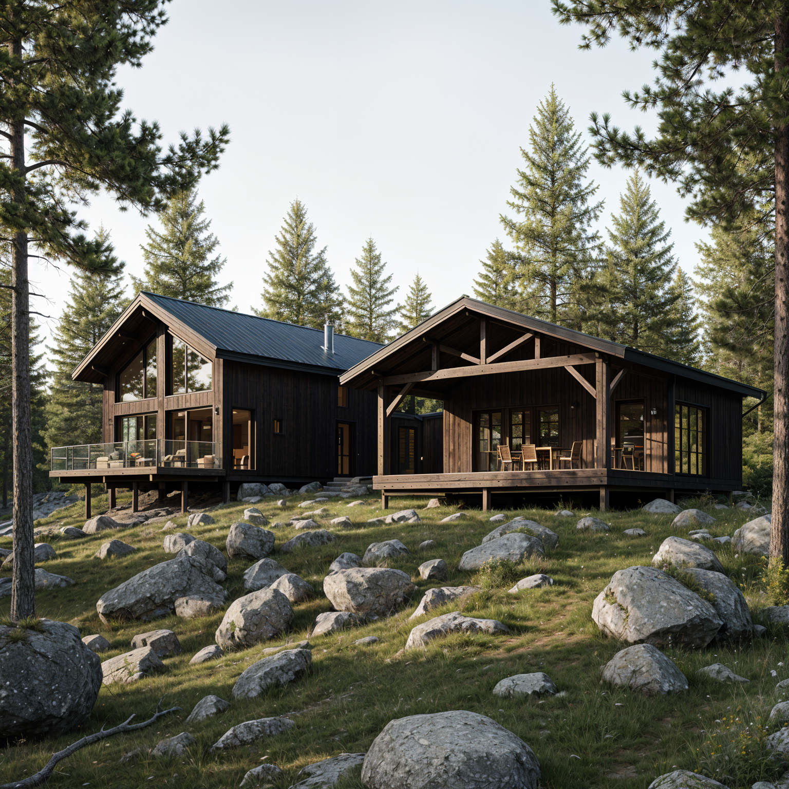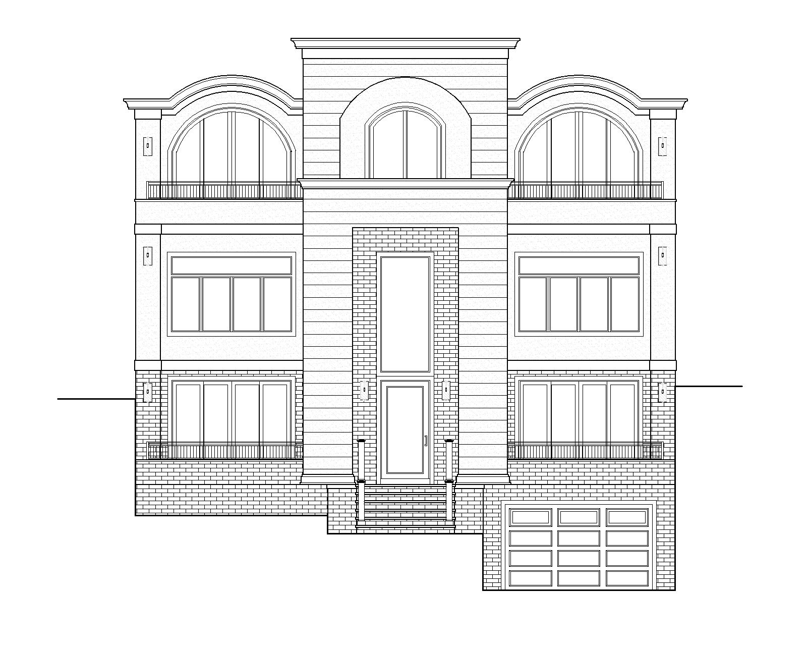 please make a realistic render with warm modern tones and black window frames set in a residential neighborhood with some large mature trees in the background material showing natural brick limestone and stucco show contemporary accents