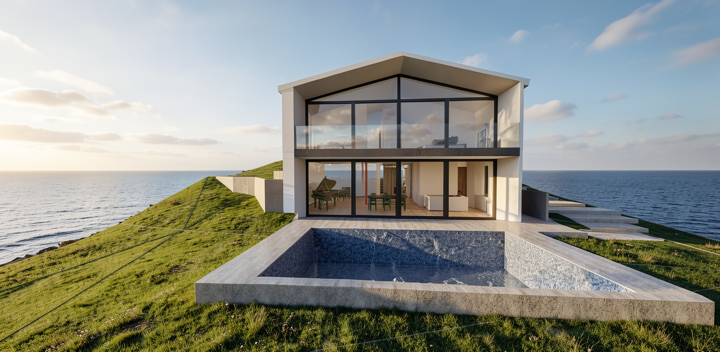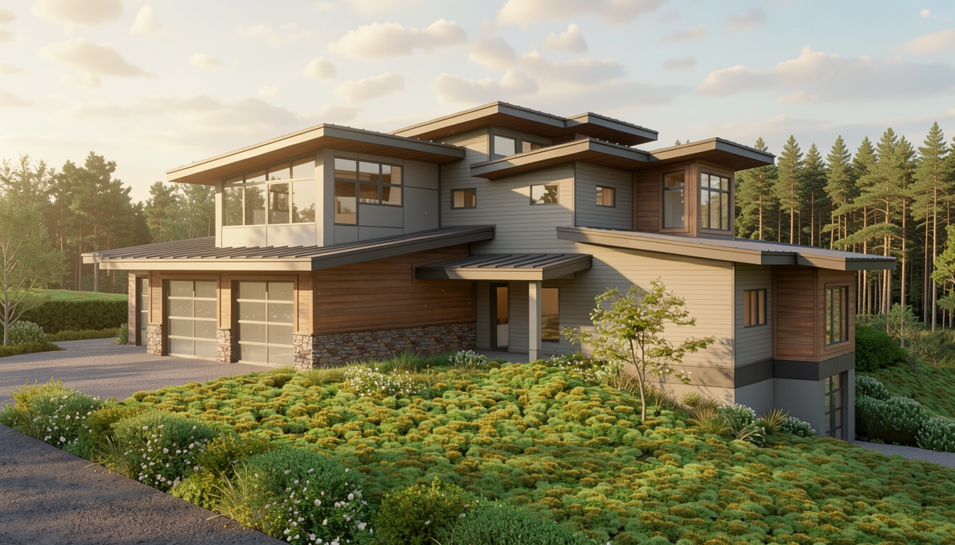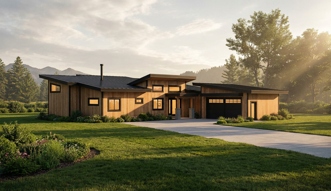front view of a clean architectural exterior home rendered in cinematic golden hour lighting with blue skies and sun streaks hitting the structure home in a mountain setting with faint streaks of light coming through trees in the surrounding area warm glow and mountain reflections off of the windows select grade vertical wood siding green manicured landscape around structure with gardens and patches of grass black standing seam metal roof prominent trees in the background high fidelity photorealistic visualization crisp shadow falloff refined facade geometry soft atmospheric depth premium architectural photography mood ultra clean composition and materials black window trim flat roof concrete driveway leading up to the black garage doors photorealistic render black window trim