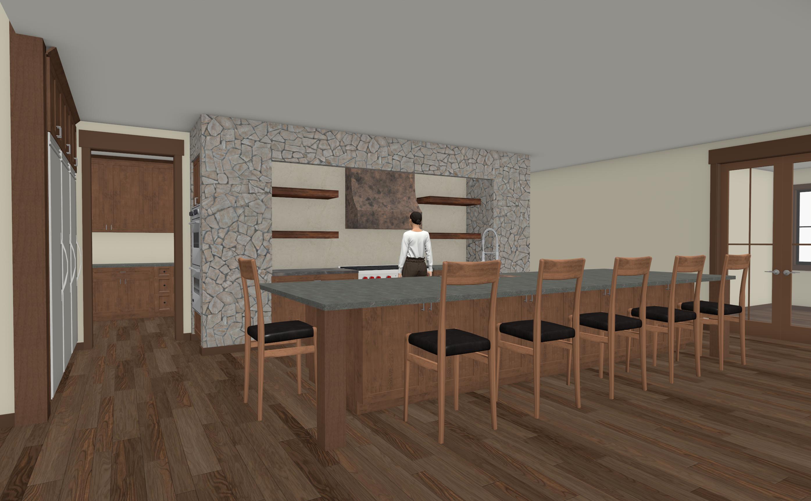 make interior look like a jackson hole interior rustic but modern add chairs at island make drywall walls and ceiling plaster it s important to keep the sizes of everything the same change textures and materials but keep the sizes of everything the same make rock realistic its important to keep to scale this room is big the person in background is 5 6 for scale do not change size of windows or doors do not add doors or windows do not change or add fixtures
