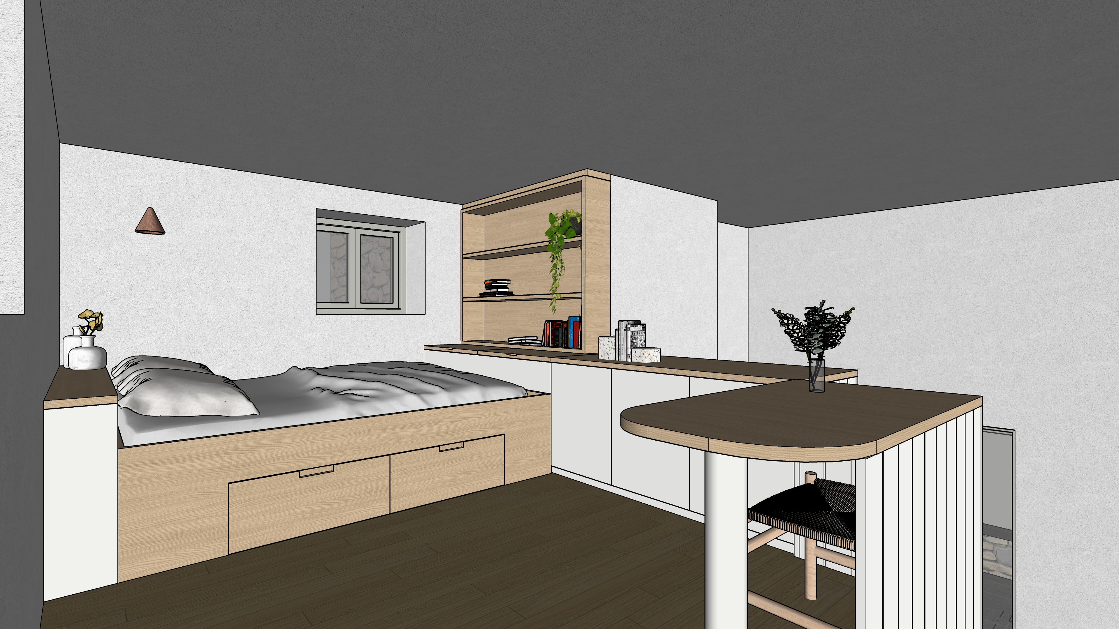 main prompt this is a cycladic house in kythnos we are in the mezzanine the floor is oak wood the base cupboards are white the shelves the bed and the desk is oak wood the bed linens are light cream the window frames are sage green the walls are white there is natural light the sconce is terracotta ceramic the stools are natural rattan the coffee tables are white wood negative prompt do not change geometry do not add objects do no change colors or materials