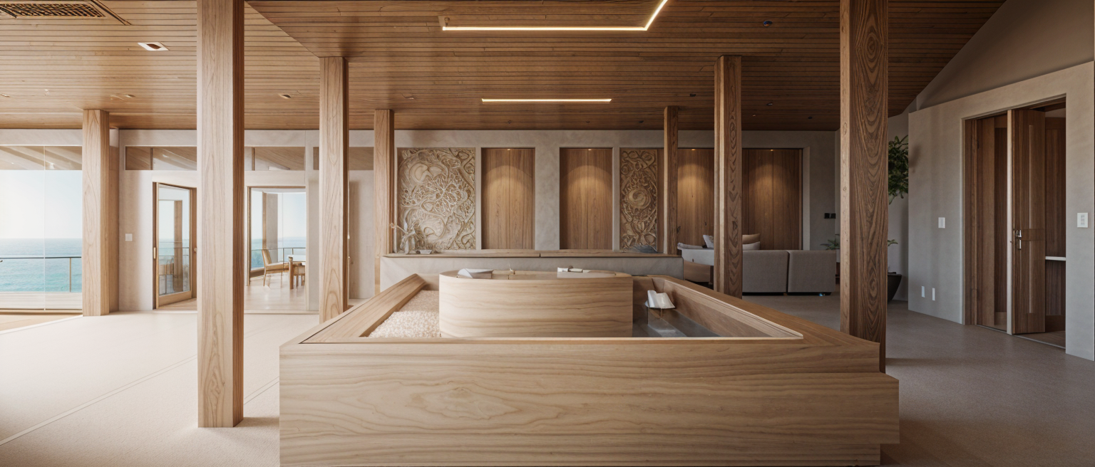 interior shot opens to outdoor patio on the right with light flowing in from right soft warm tones and lighting