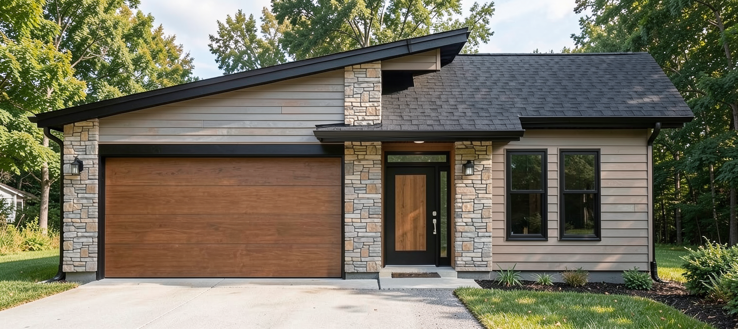 front view of a clean rustic a frame cabin architectural exterior home rendered in cinematic vibrant day time lighting with big clouds in the sky cabin in the forrest with streaks of light coming through the trees warm glow and reflections off of the windows rustic select grade vertical warm wood cedar siding green manicured landscape around structure with gardens and patches of grass black standing seam metal roof prominent cinematic forest with big douglas fir trees and ferns and moss surrounding behind the house in the background high fidelity photorealistic visualization crisp shadow falloff refined facade geometry soft atmospheric depth premium architectural photography mood ultra clean composition and materials dark trim around windows flat roof photorealistic render concrete path leading to the patio