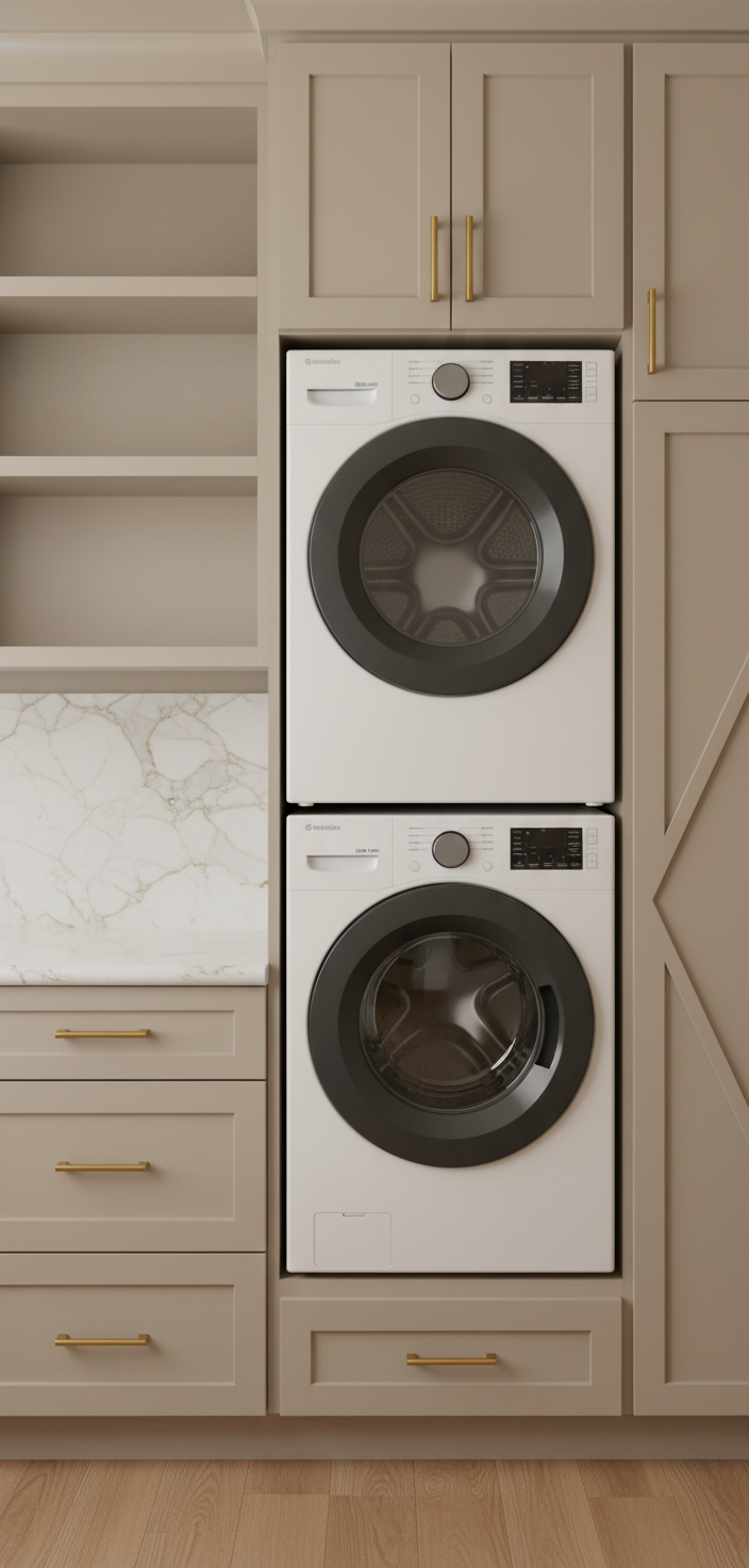 take this elevation and render it with the cabinets paint color sherwin williams accessible beige cabinets should have sleek brass hardware pulls on the drawers and doors the reference image attached is the style of washer dryer combo to include the area above the drawers where the drip dry is should have taj mahal full slab there is no crown at the top i want the entire elevation shown not just a portion