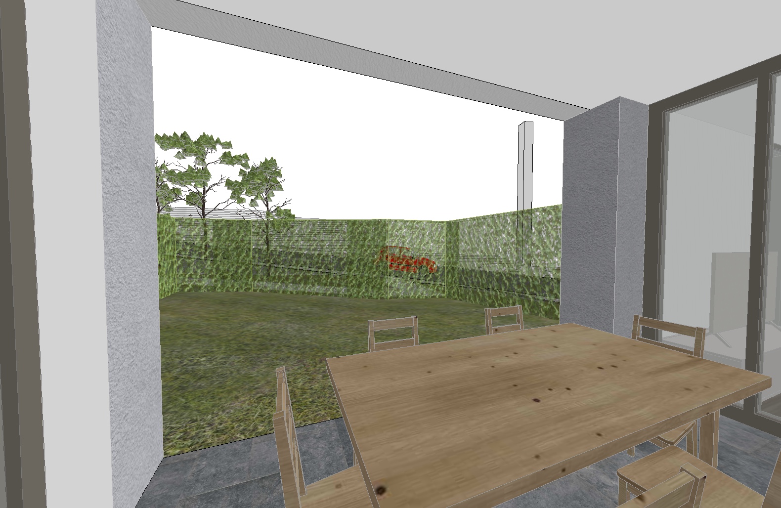 render a modern outdoor patio scene basking in the warm glow of a late afternoon sun the atmosphere is serene and inviting with soft golden sunlight casting gentle shadows across the scene elements architecture sleek white modern buildings with glass features adding a sense of openness walls textured light gray with subtle shadow play fence lush green ivy vibrant and healthy grass well manicured and deep green trees don t change the position of the trees and don t add further trees mature and leafy providing additional depth with rich green foliage patio bluish gray stone tile flooring cool and elegant furniture natural oak wood table and chairs warm and inviting position of the sun east is in front of the image time 10 00 day 21 4 background don t add any buildings
