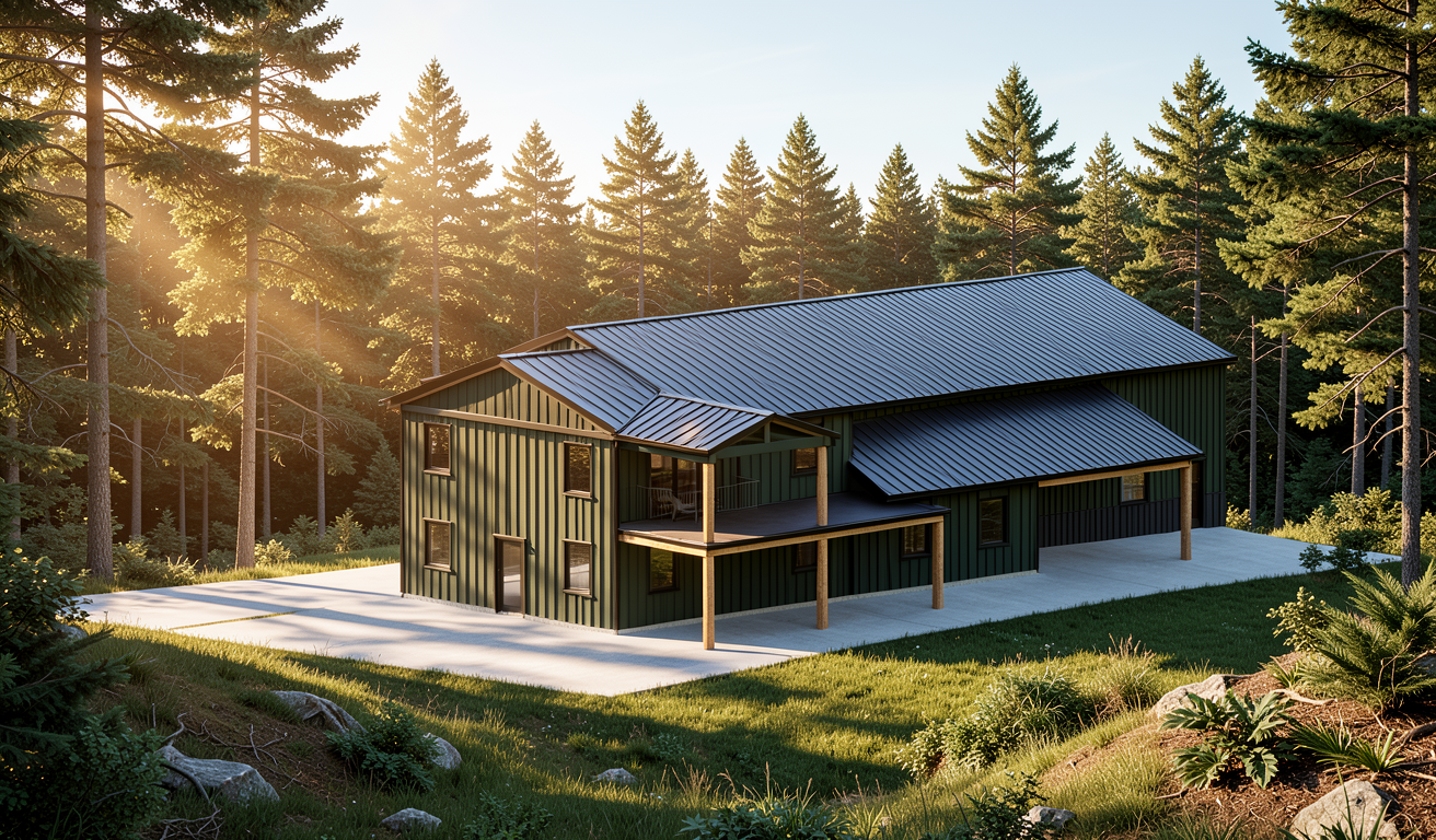 a modern two story farmhouse with dark green vertical board and batten siding black standing seam metal roofing and natural timber posts supporting the full length covered patio retain the exact structure window arrangement patio columns balcony rooflines foundation height and proportions exactly as shown in the reference image add a smooth concrete front driveway extending toward the house integrated naturally into the flat terrain surround the property with a lush dense forest of tall mixed evergreens and hardwoods place the sun behind the trees so warm golden sunlight beams through the branches casting soft rays and subtle dappled highlights across the patio siding and grass create ultra realistic lighting crisp shadows detailed textures in the wood siding and glass reflections and a vibrant clear sky with light atmospheric depth render in hyper realistic architectural visualization quality 8k resolution