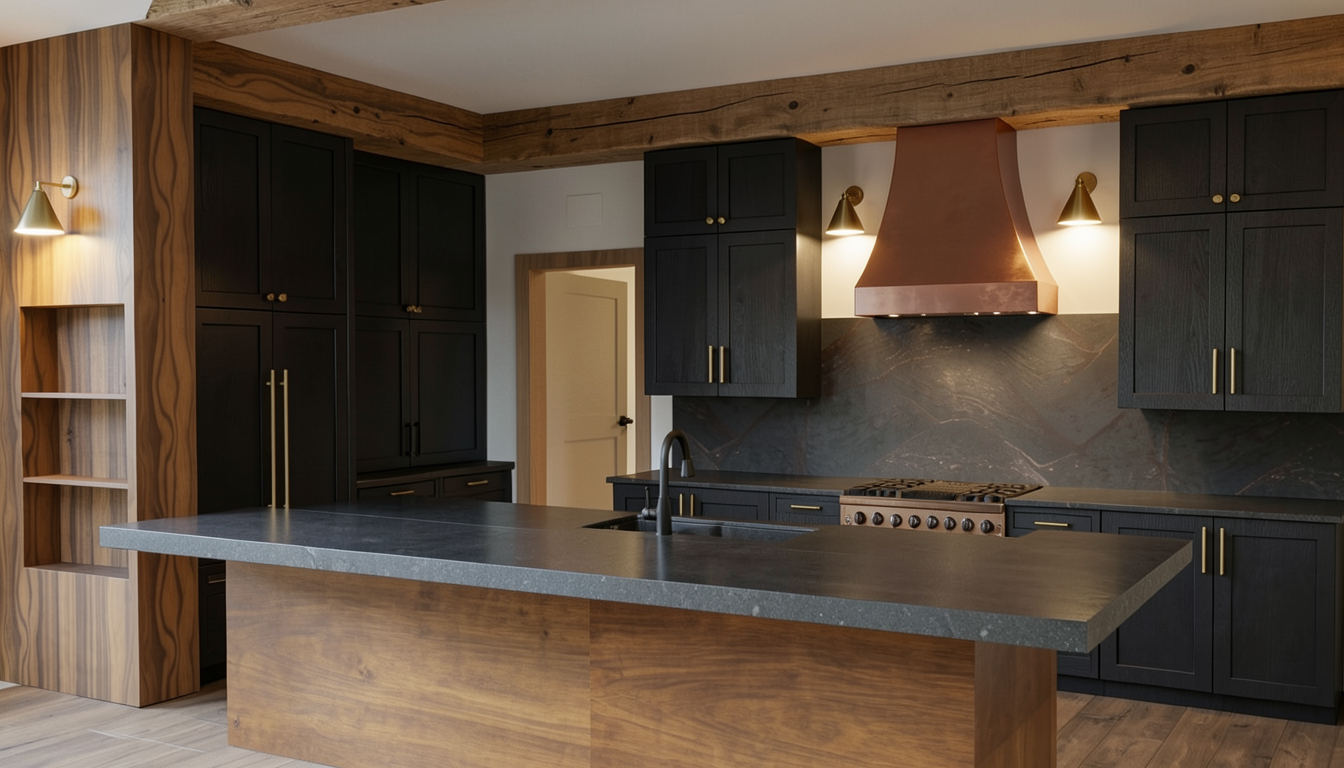 photorealistic interior kitchen render maintain the exact layout proportions and colors from the model dark ink wood shaker cabinets maintain the same color as the image shown with wood graining going through with warm brass hardware large island with rich medium caramel stained wood panels and the same wood mediym carbel stained countertop perimeter countertops are dark stone full height backsplash behind the range is a dark natural stone slab with subtle movement range hood is brushed aged copper metal slightly worn soft sheen not shiny upper soffit beam wrapping the room is warm natural wood with visible grain there are no lights in the beams they are a natural old looking beam open shelving on the left is wood to match beam the faucet is a matte black all exterior knobs and pulls on cabinets are brass wall sconces are warm brass with soft warm light doorway in the back wall is a pocket door opening no swing door visible lighting should be warm realistic residential lighting soft shadows natural reflections high realism do not change materials do not change colors do not redesign make it look like a real photographed kitchen cabinets are stained wood not paint visible oak grain texture