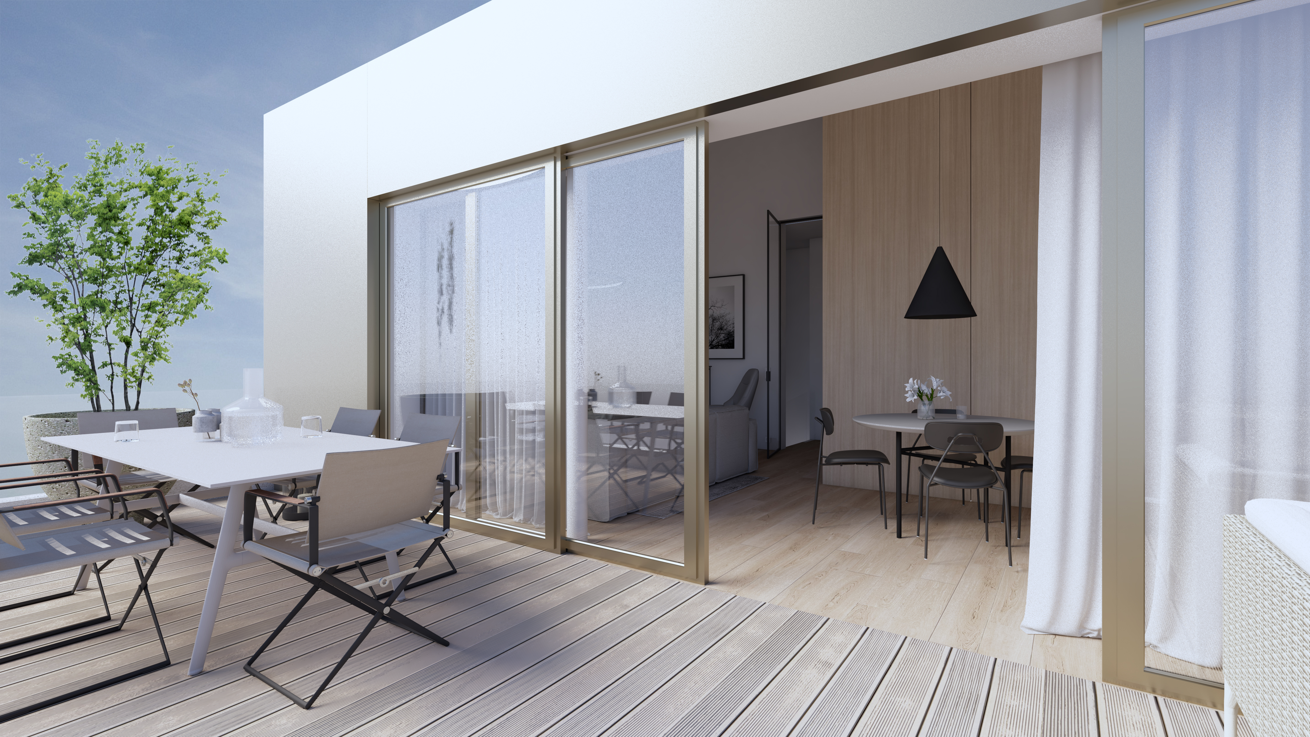 fill in the free part on the left with the sloping roof of the neighboring house so that it continues parallel to the existing visualization of the upper floor extension improve and add greenery on the garden terrace gray clouds