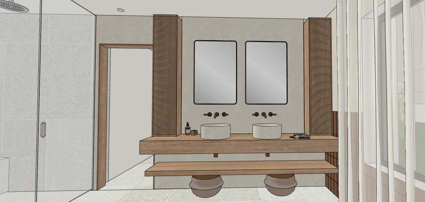 organic and luminous bathroom with stone tile floors in light beige