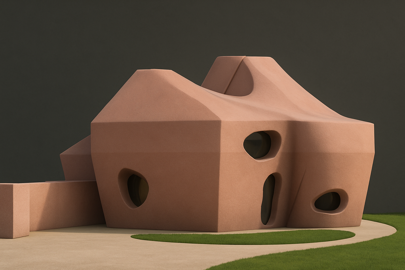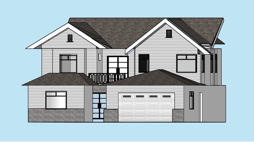 exterior shot upstairs left side is a bump out window seat render a modern two story house with a gabled roof in a serene and inviting atmosphere the roof should be a textured charcoal gray the house exterior is clad in white horiztontal and vertical siding with white trims around the windows and eaves the lower part of the walls features a brick texture in a muted natural lime stone the front door is a sleek design with light blue glass the garage door is a crisp white with subtle panel details set the scene in a warm golden sunset casting soft ambient light with well manicured greenery around the building to enhance the welcoming feel located with neighbors in pacific palisades ca