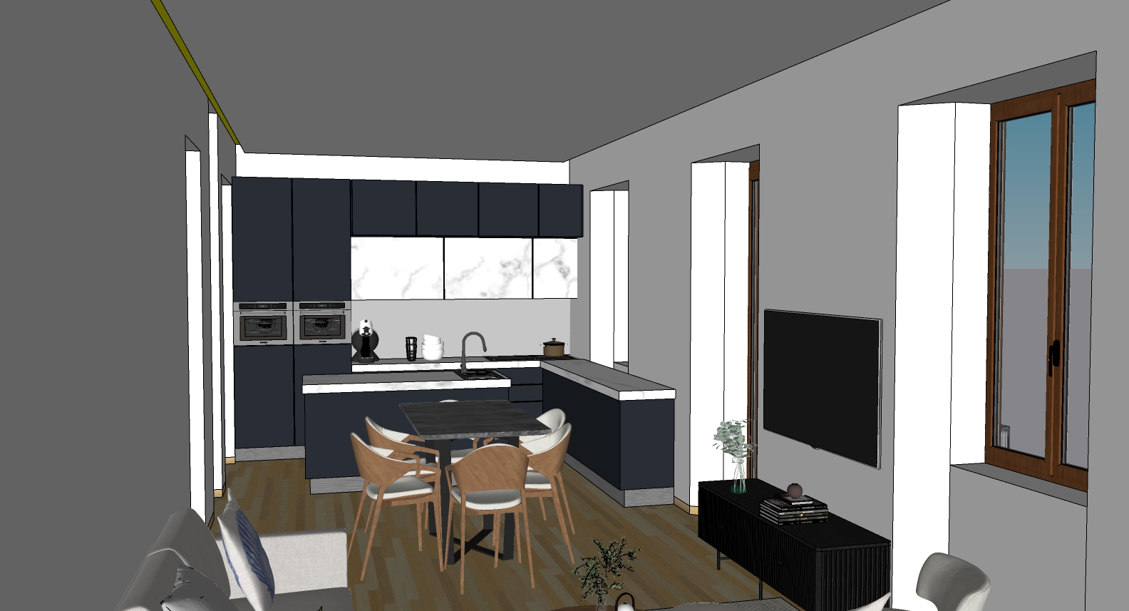 transforms the provided image into a high end photorealistic rendering with warm golden hour atmosphere soft and bright lights that keep everything in exactly the same proportions same wall finishes same materials and same spatial configuration do not move or alter the geometries of objects textures colors or furniture positions the geometries and curves must be equal the top left piece of wall should remain curved white plaster walls led along the perimeter of the ceiling